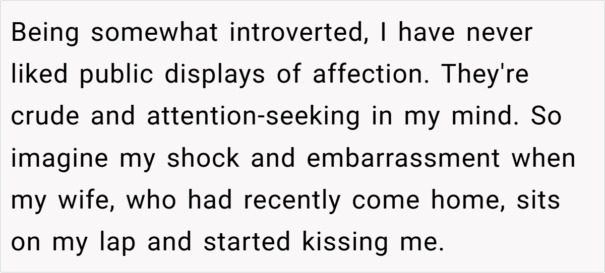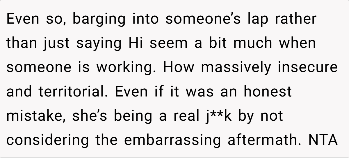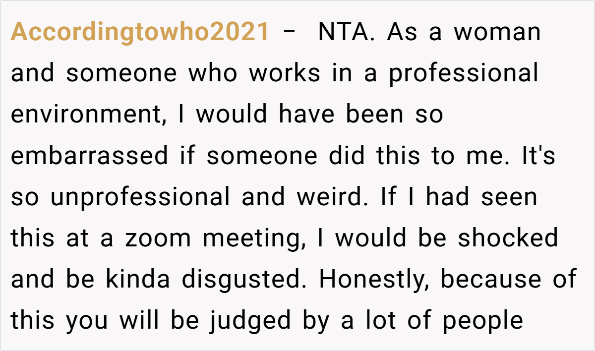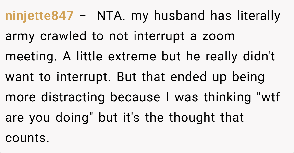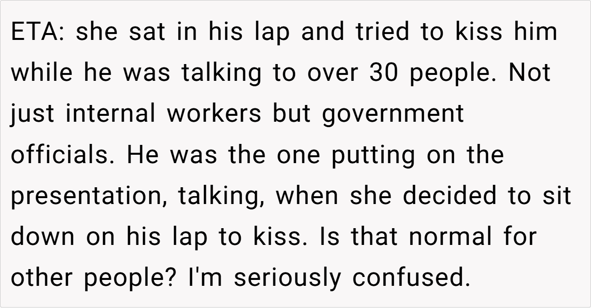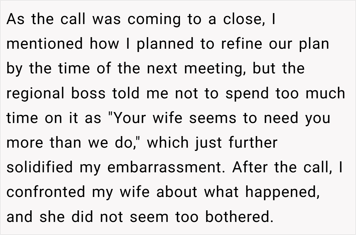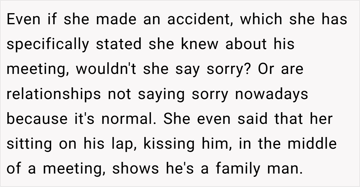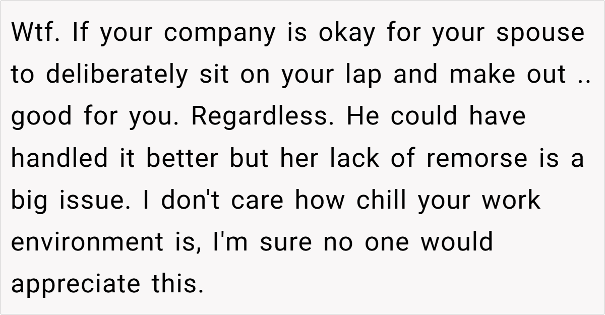 Overall, many commenters sympathized with the husband’s deep embarrassment and agreed that public displays of affection during an important work meeting were inappropriate. Most felt that his reaction was not only oversensitive, but also reflected legitimate frustration at personal boundaries being infringed upon in a professional setting. However, some believed that his wife’s spontaneous behavior was intended to demonstrate her pride as a “family man,” albeit at an inappropriate time.