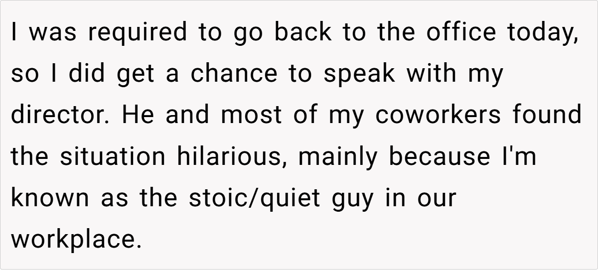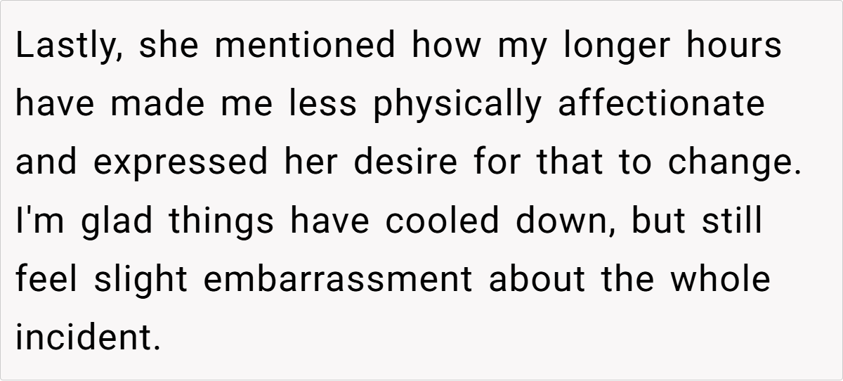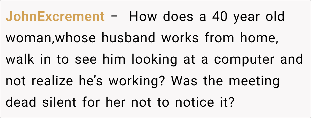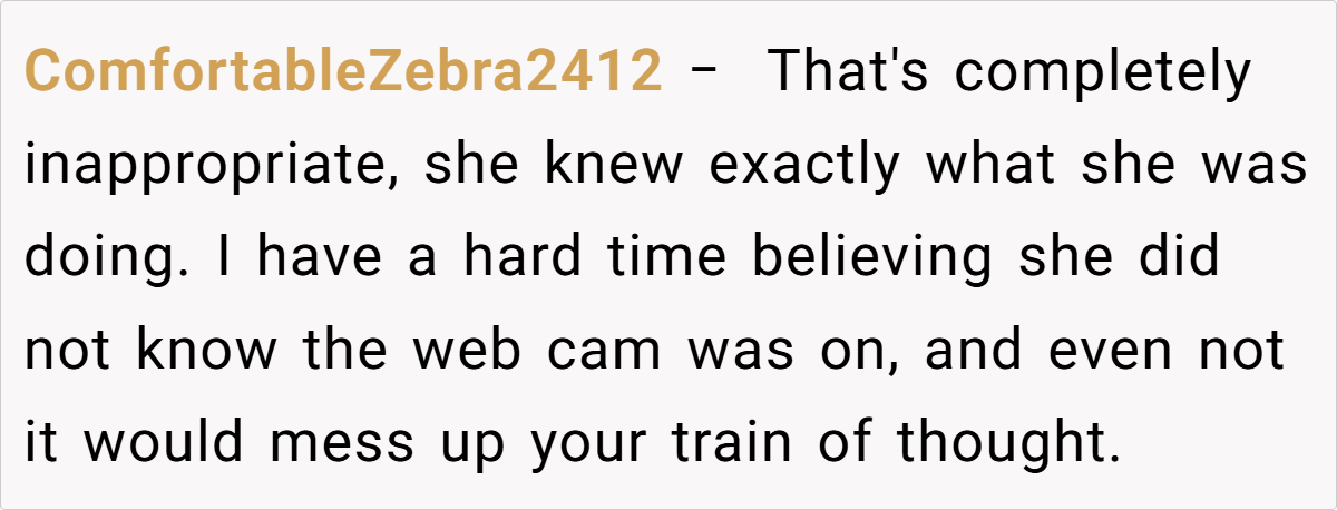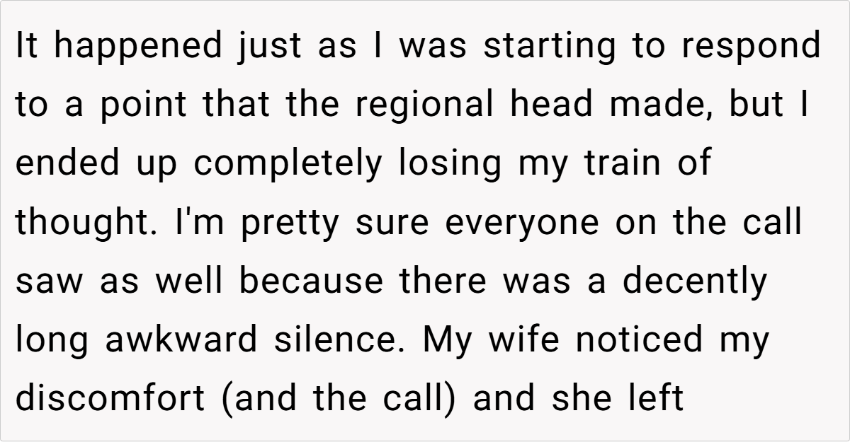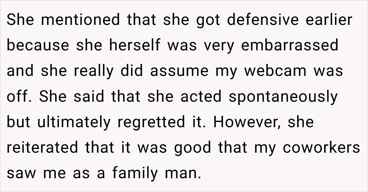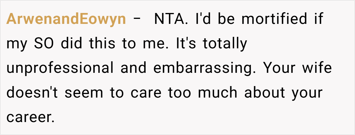 There was a consensus that both partners should work together to establish clearer boundaries between work and home, ensuring that such personal moments do not interfere with professional obligations. Ultimately, while opinions varied, most agreed that maintaining a respectable professional image was important and that his feelings of humiliation were understandable.