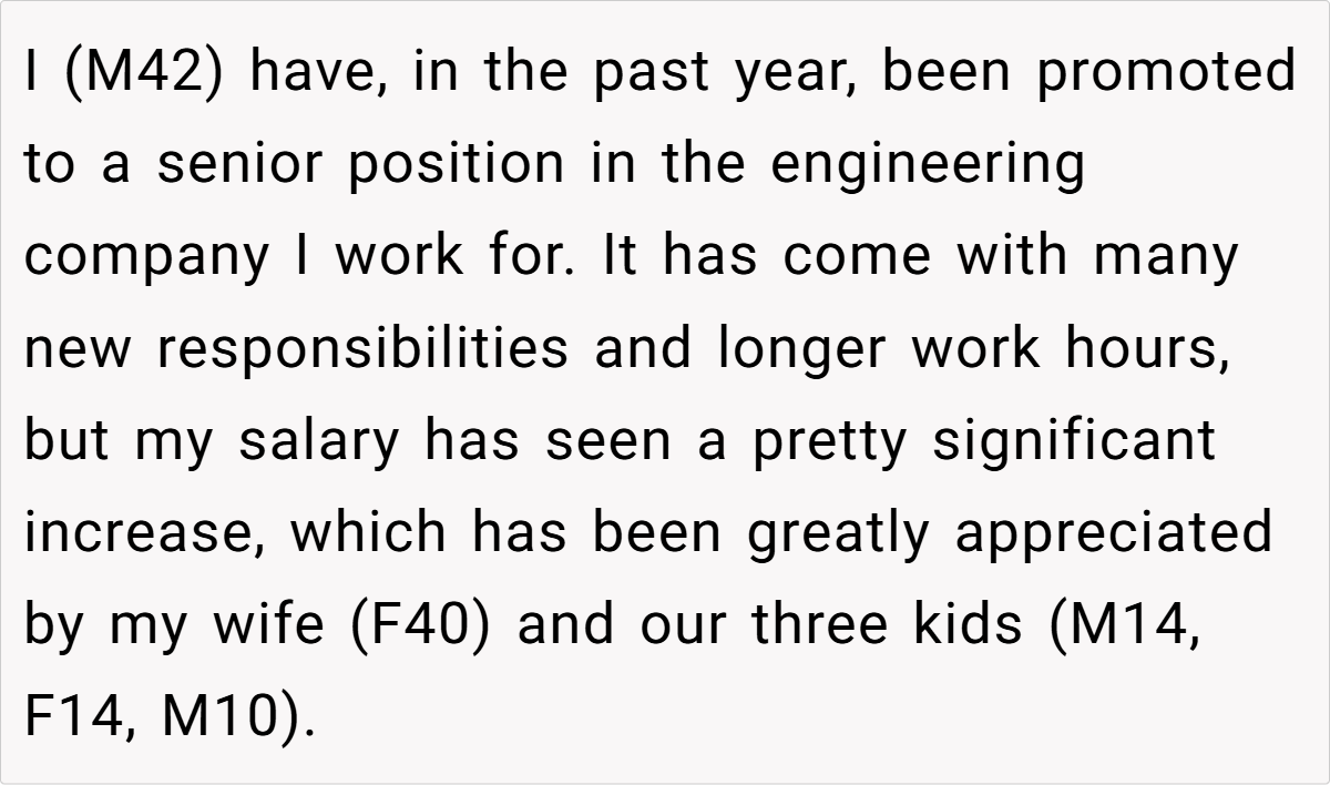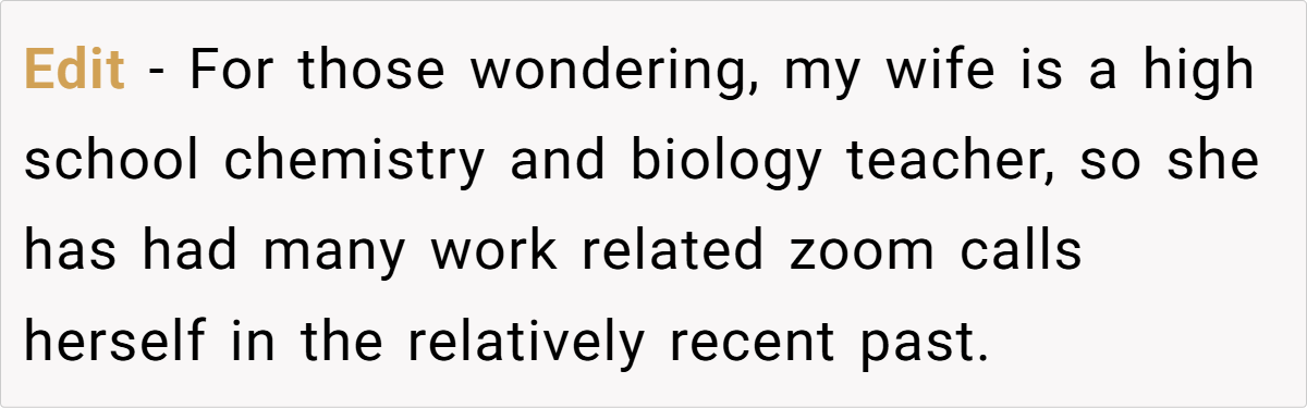 With a recent promotion came higher stakes and longer hours, which his wife (F40) and their three kids have embraced in different ways. While his colleagues know him as the quiet, stoic professional, an impulsive moment at work shattered that image when his wife unexpectedly sat on his lap and kissed him during a high-profile video call.