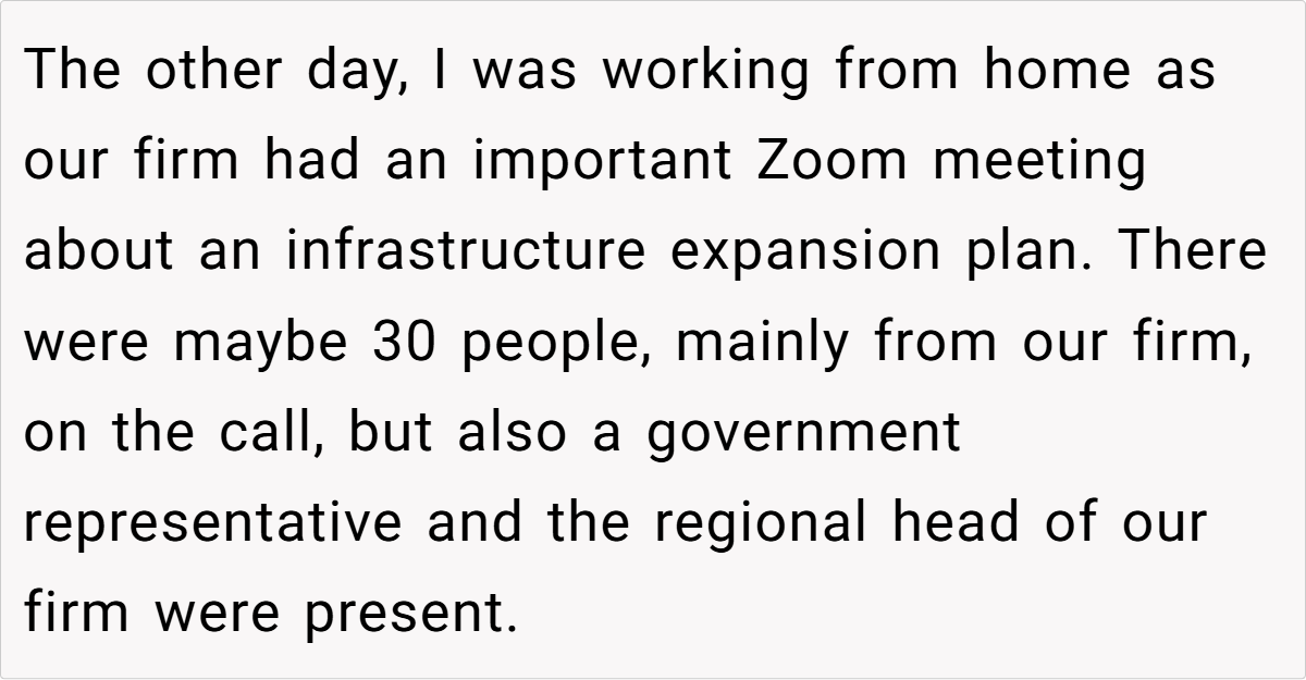 Family and work rarely mix but when they do, the fallout can be nothing short of mortifying. In this story, a senior engineer (M42) finds himself trapped between professional expectations and his personal life when a well-intended, yet disastrously mistimed, display of affection derails an important Zoom meeting.