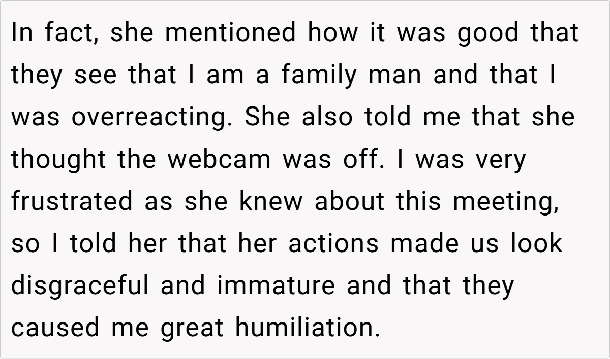 The incident left him red-faced, scrambling to regain his train of thought as awkward silence filled the virtual room. Later, when his wife claimed she was simply being a “family man” and that she assumed the webcam was off, he lashed out telling her that her actions made them look disgraceful and immature.