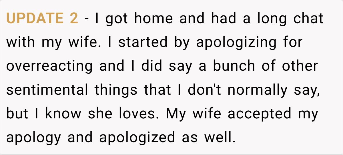 While your wife’s actions may have been meant to celebrate your family identity, they inadvertently embarrassed you during a crucial work moment. Your feelings of humiliation and frustration are understandable given the context, and it appears that both you and your wife have taken steps to resolve the conflict.