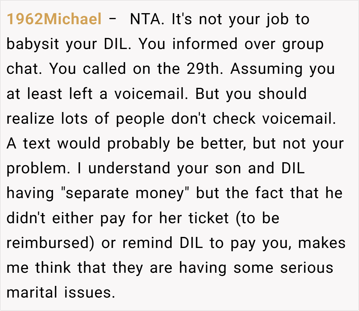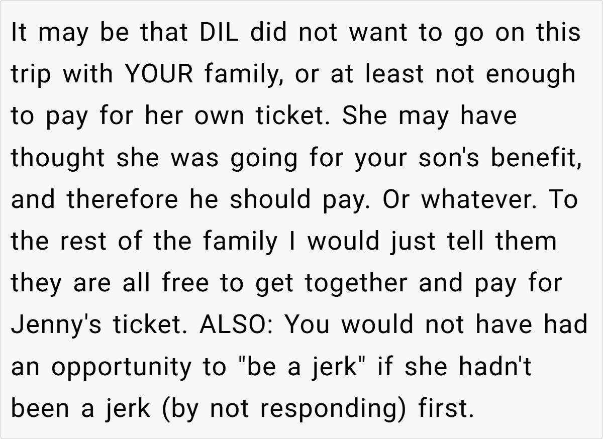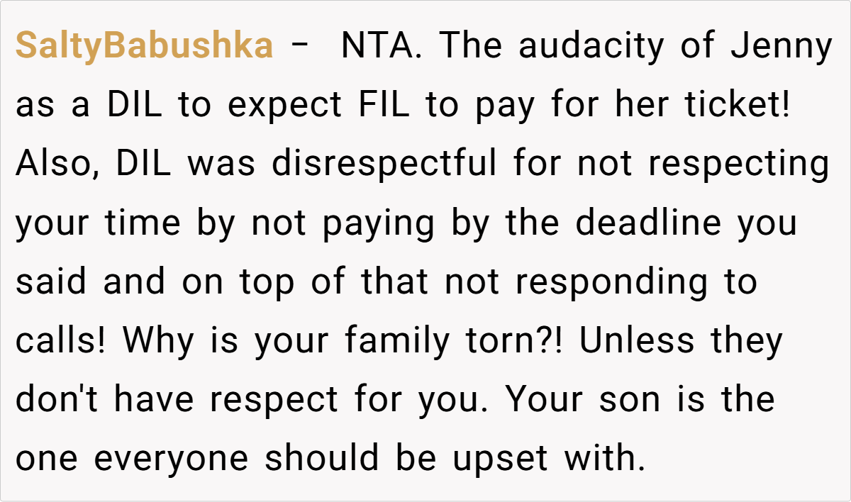 The majority of Reddit community opinions suggest that the OP is not at fault (NTA) because he set a clear deadline for collecting the money and communicated it properly. Comments highlighted that Jenny (the DIL) showed irresponsibility by missing the deadline and failing to respond promptly, emphasizing that it wasn’t the OP’s duty to chase her for payment.