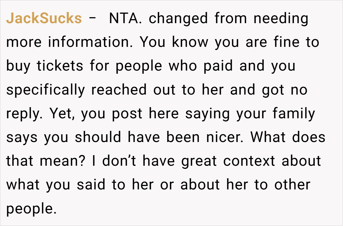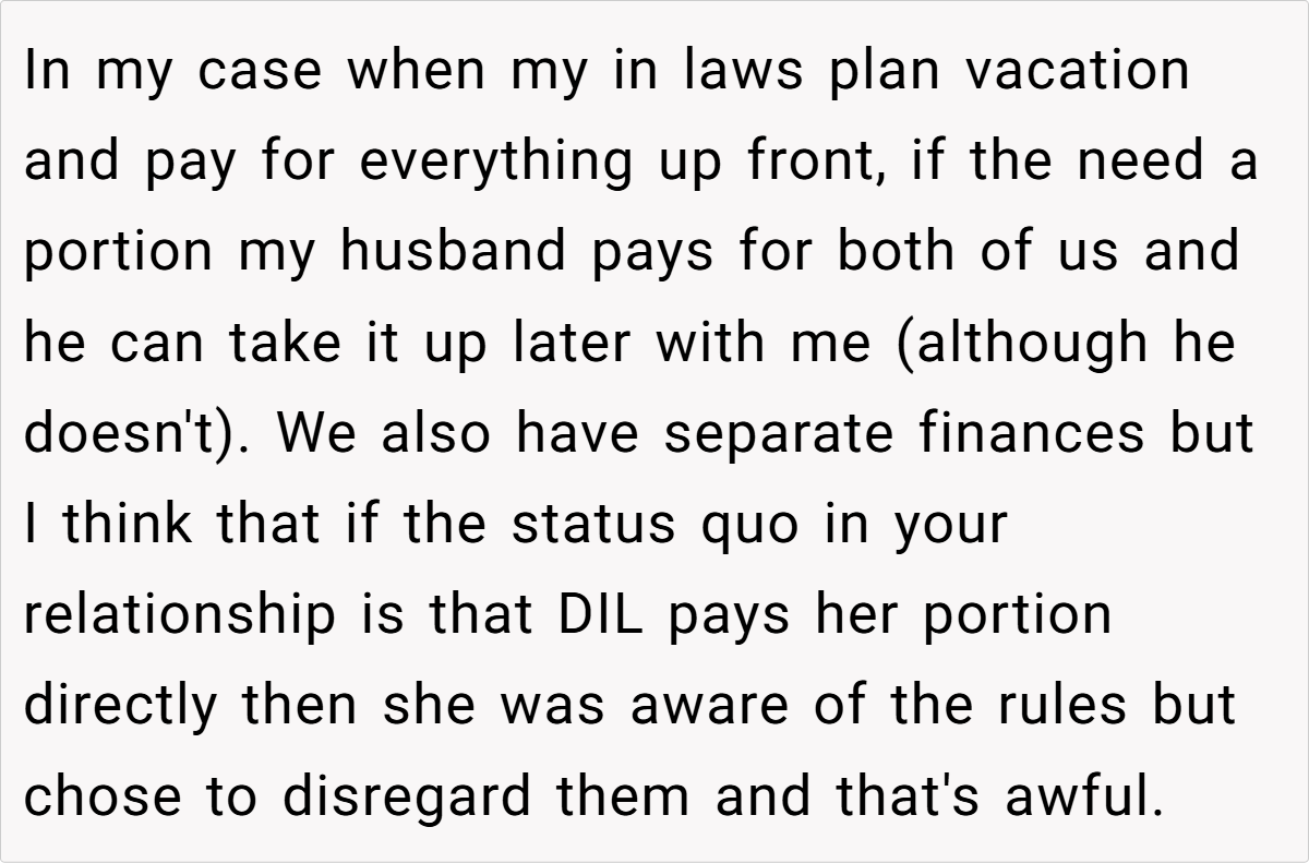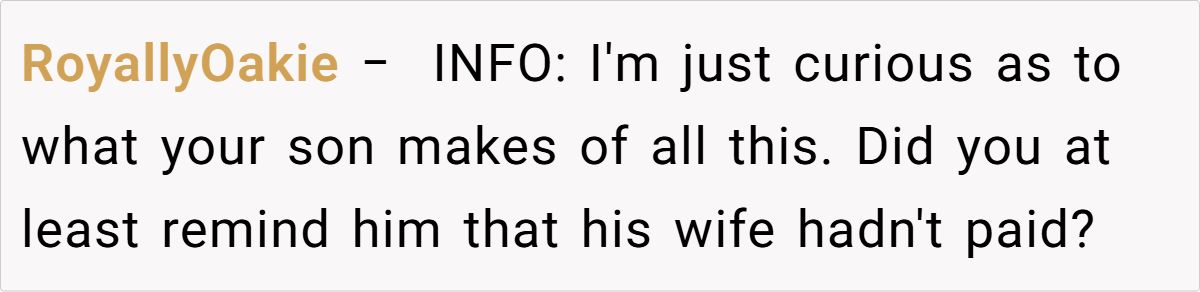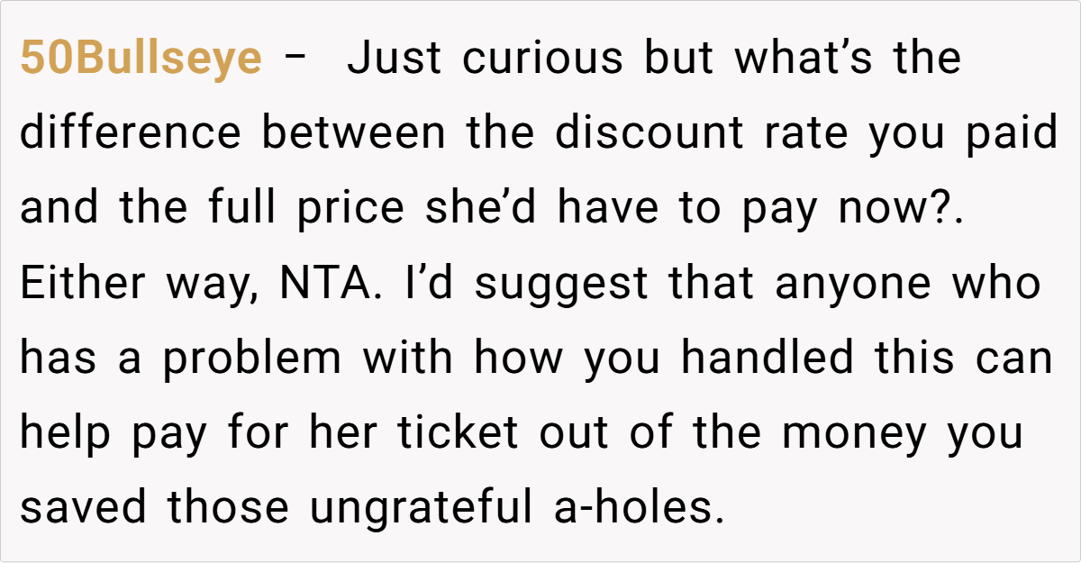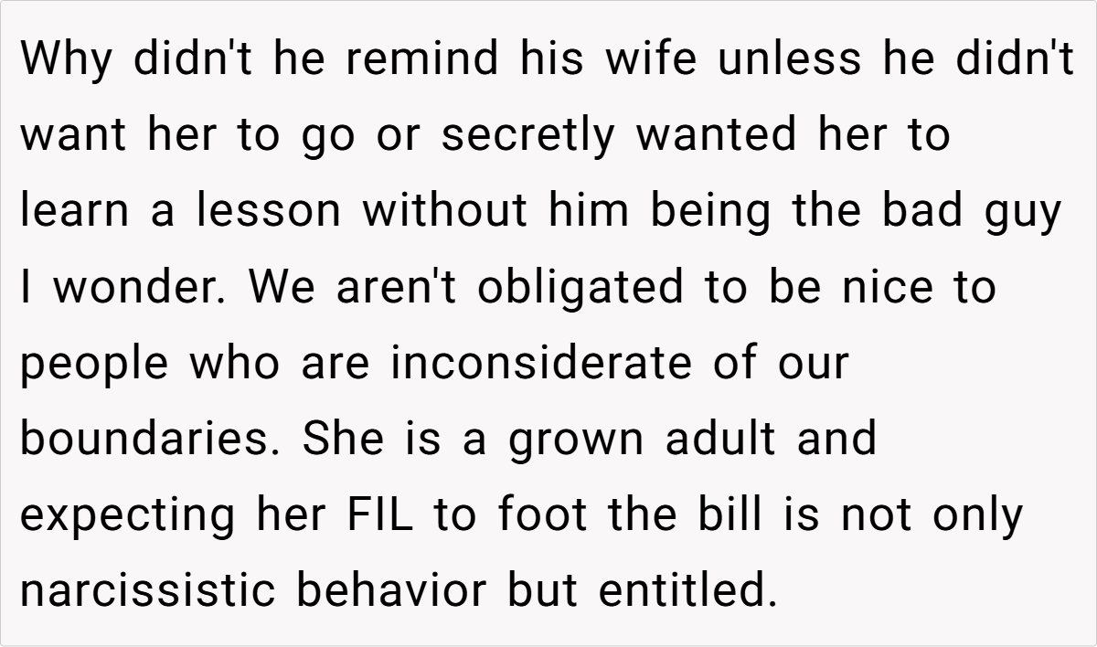 The majority of Reddit community opinions suggest that the OP is not at fault (NTA) because he set a clear deadline for collecting the money and communicated it properly. Comments highlighted that Jenny (the DIL) showed irresponsibility by missing the deadline and failing to respond promptly, emphasizing that it wasn’t the OP’s duty to chase her for payment.