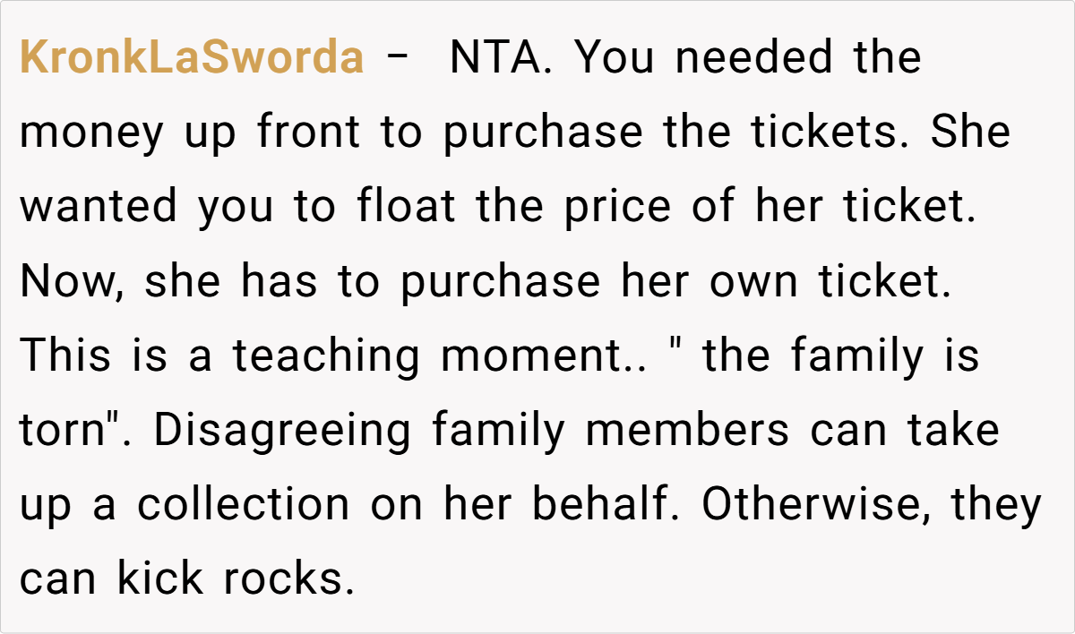 Analyzing the OP’s situation reveals the tension between a well-intentioned plan and the unpredictable nature of personal habits. On one side, the retiree’s insistence on a deadline was a practical measure to secure the discounted tickets. On the other side, Jenny’s habitual tardiness and miscommunication exacerbated the conflict. This discrepancy in expectations created a ripple effect that ultimately led to family discord. A closer look shows that the issue isn’t solely about money—it’s about setting boundaries and following through on commitments.