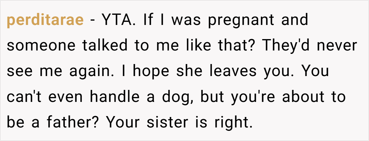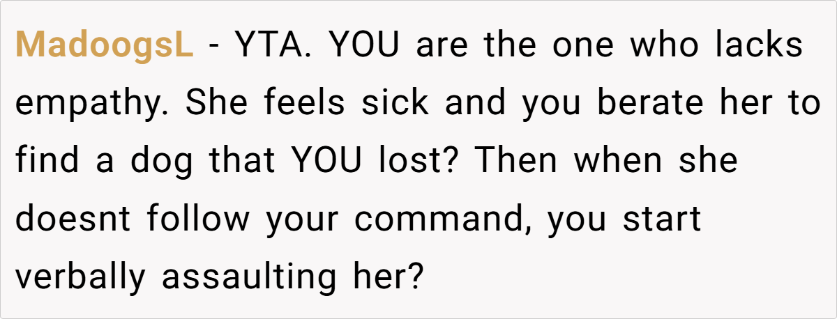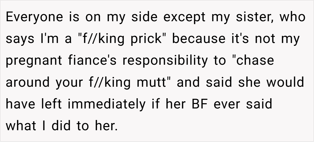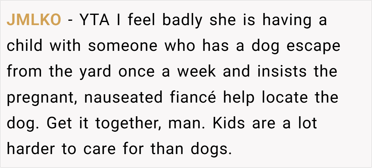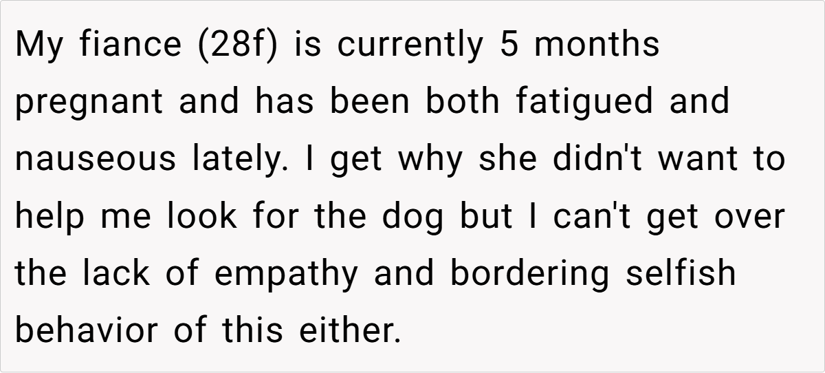 A soon-to-be father is facing backlash after berating his pregnant fiancée when she refused to help search for his runaway dog. While he insists that his panic and fear justified his reaction, others believe that he displayed a shocking lack of empathy for his exhausted and nauseous partner.