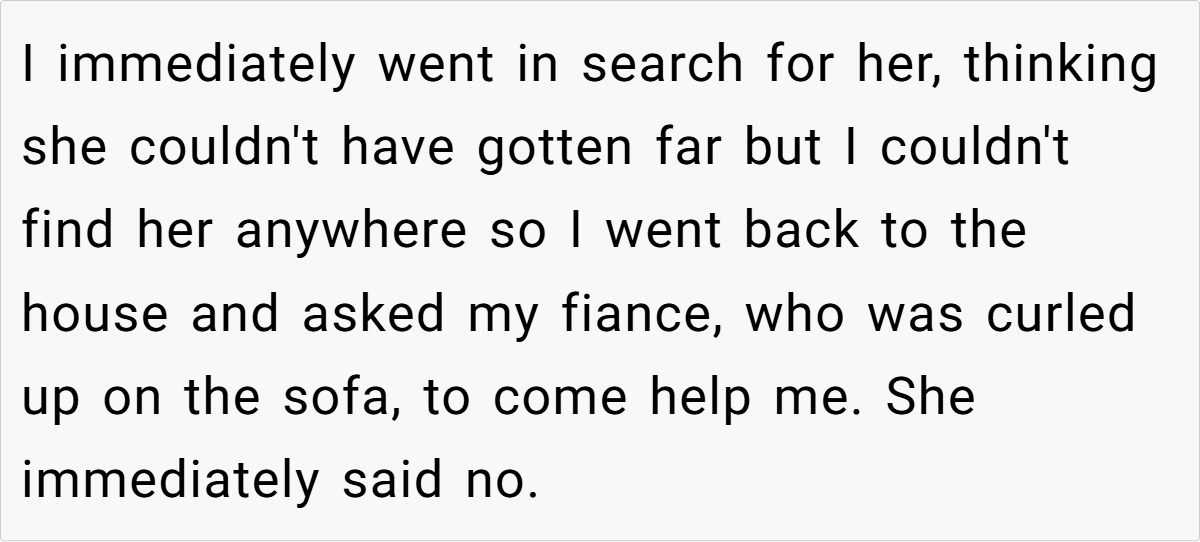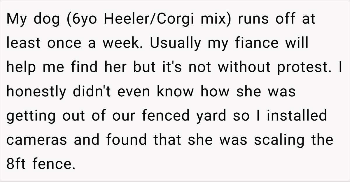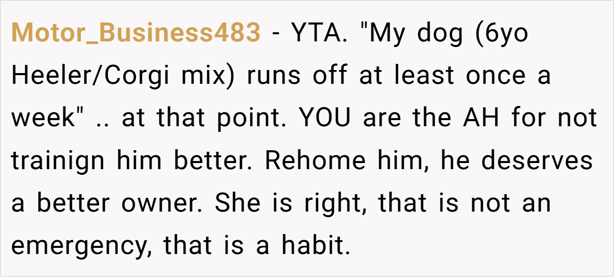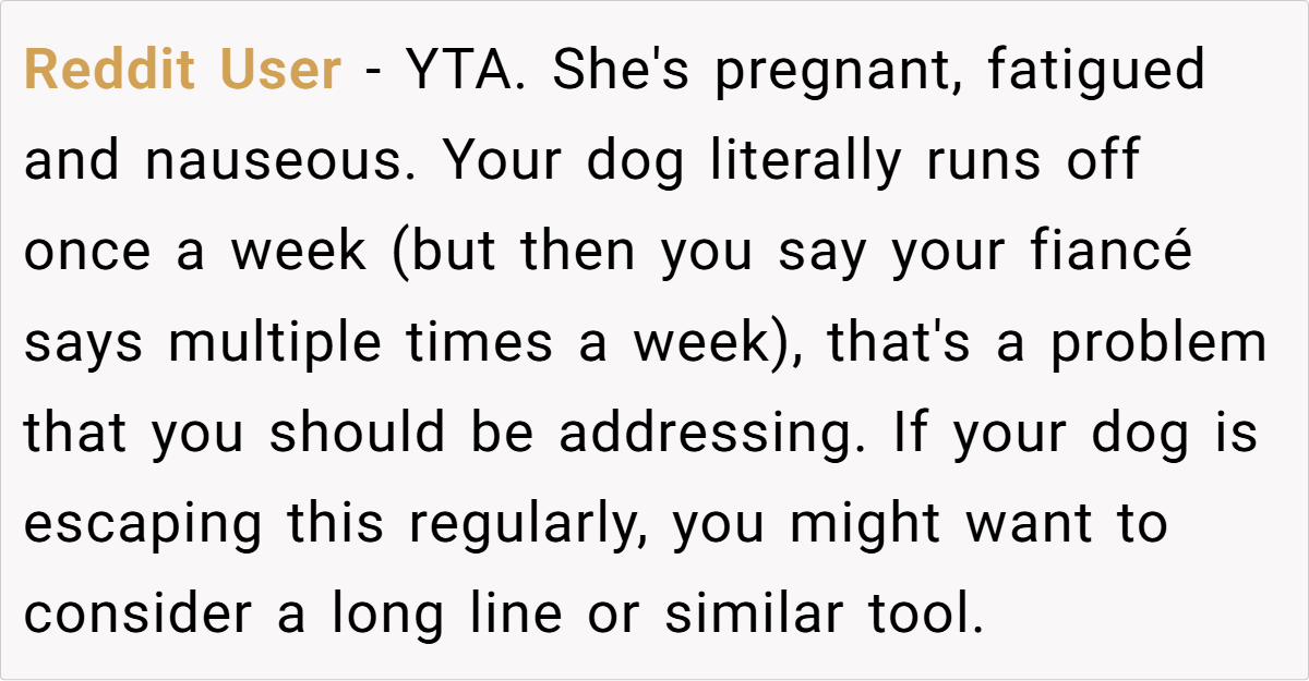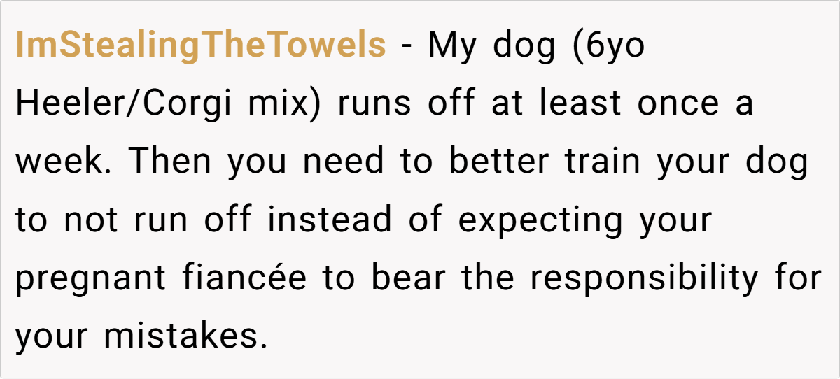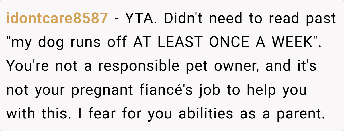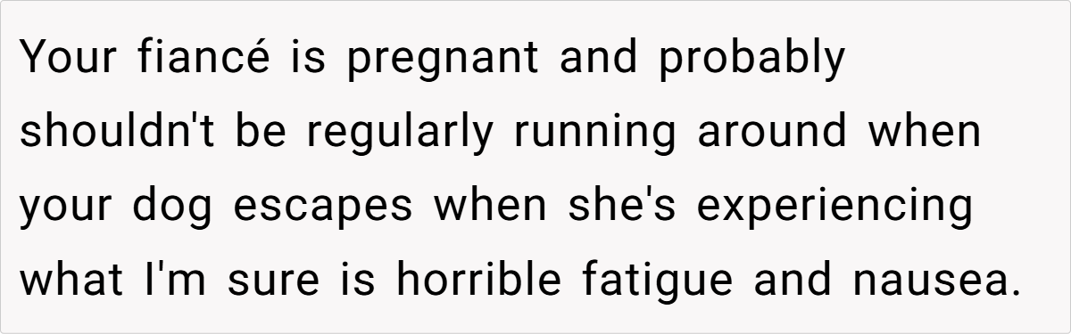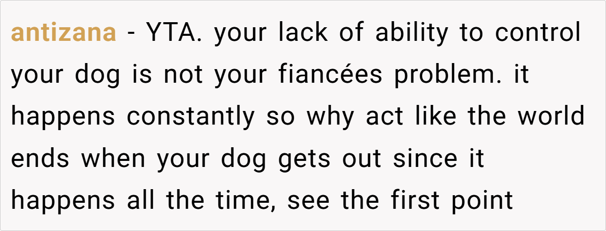 But with a dog that escapes at least once a week, is this really about the fiancée’s refusal—or a long-standing issue of irresponsibility?