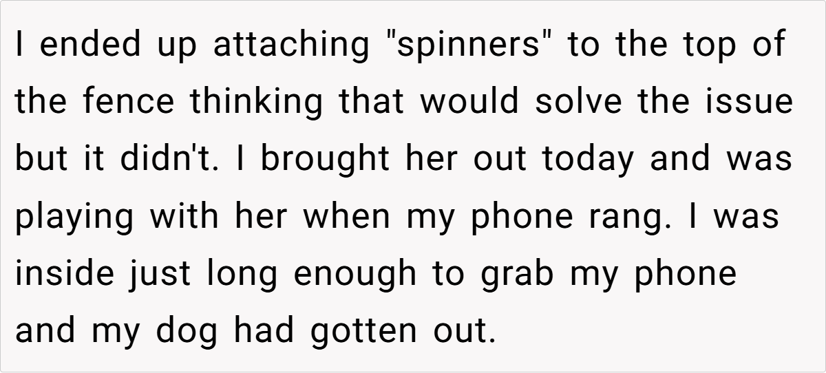 - Hire a professional trainer to work on recall commands and fence boundaries.