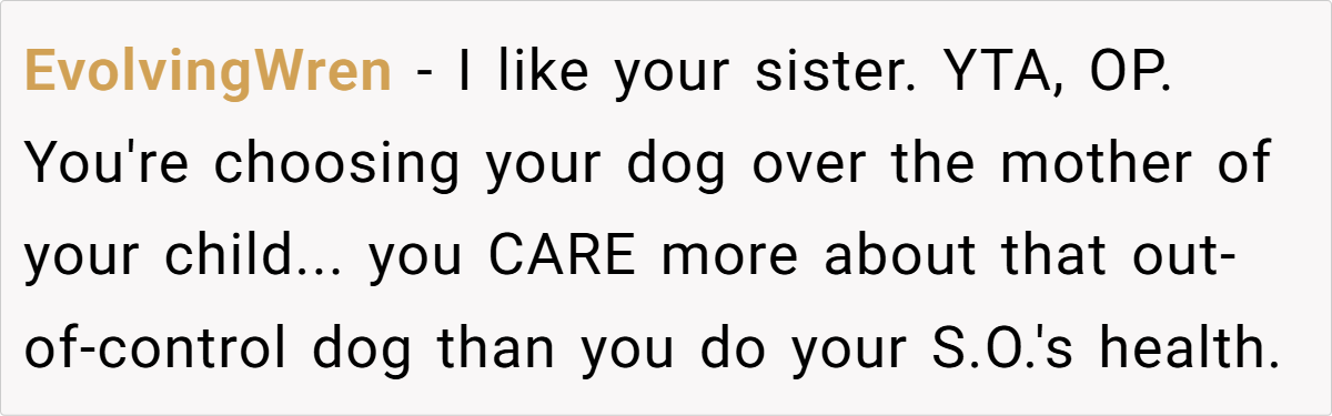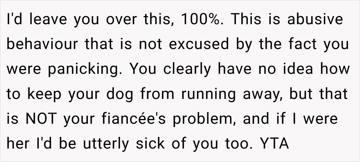 At this point, the dog’s safety is in jeopardy. Instead of shaming his fiancée for not wanting to participate in a crisis he created, the owner should be taking responsibility and implementing real solutions.