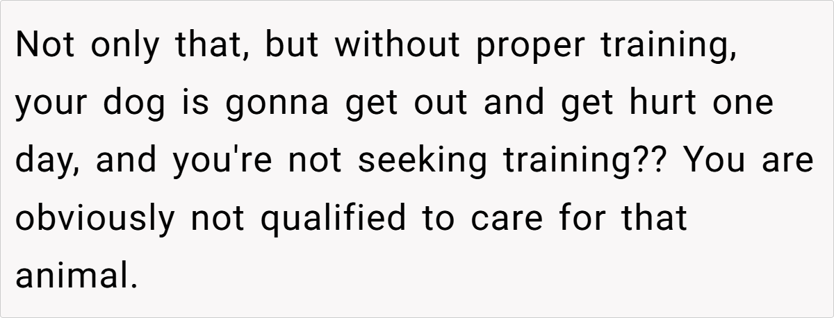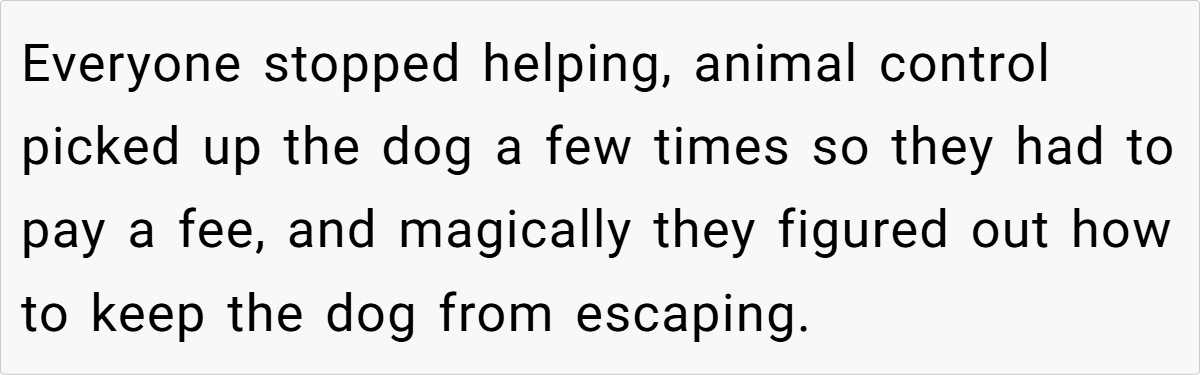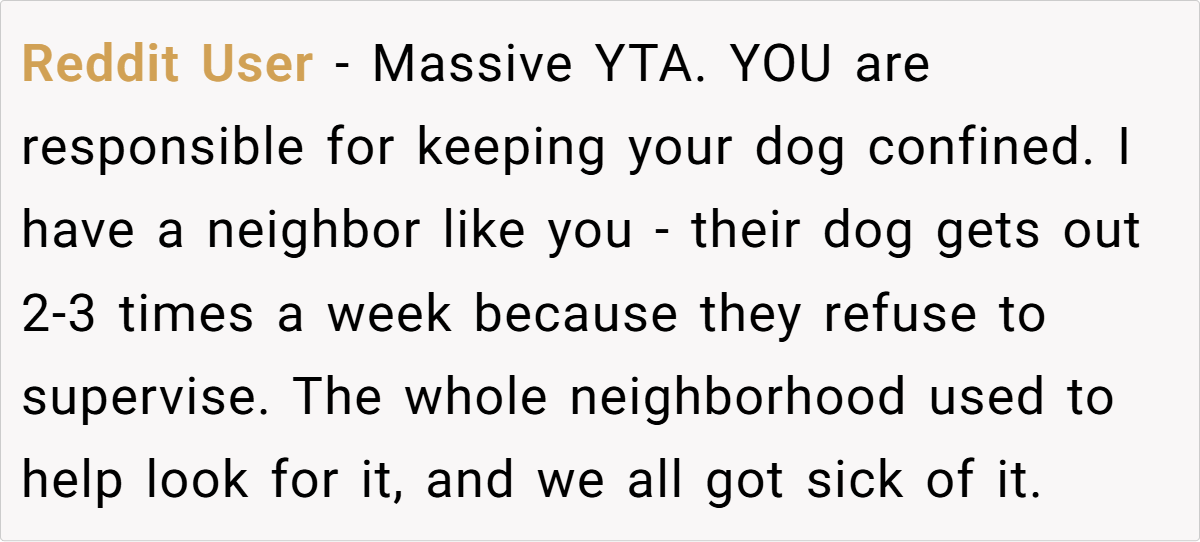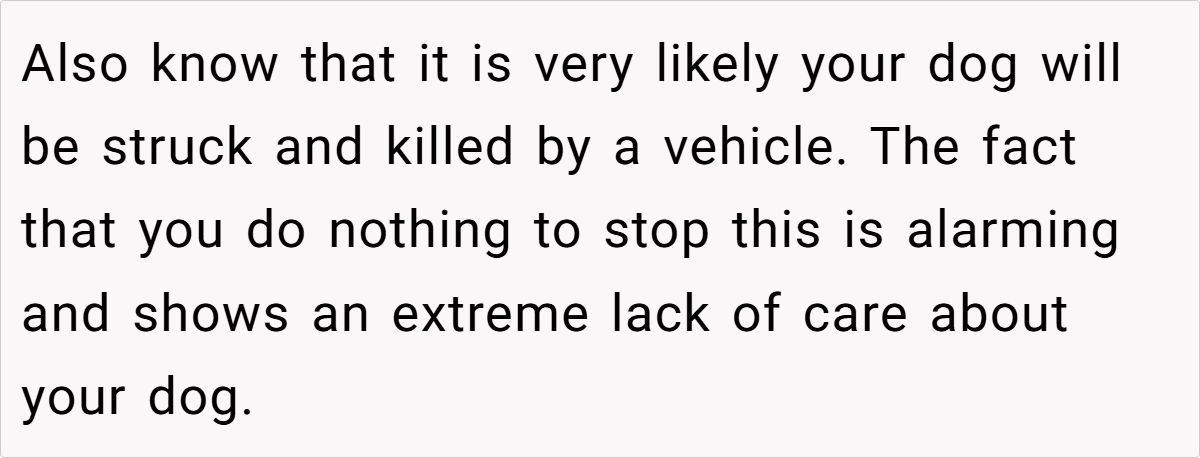 Dog trainer and behaviorist Sarah Jennings explains: “If a dog repeatedly escapes, it is not an accident—it is a failure of proper containment and training. A responsible owner would have reinforced their fencing, used a GPS tracker, or implemented better recall training long before this became a weekly emergency.”