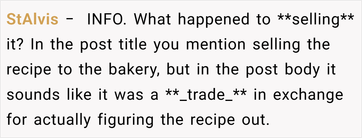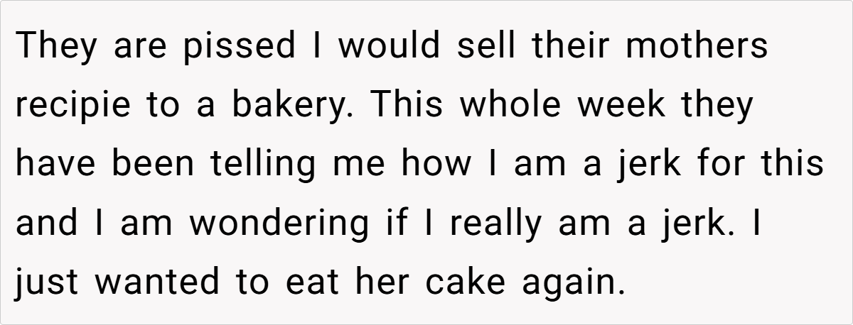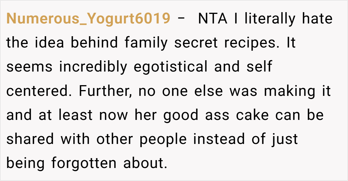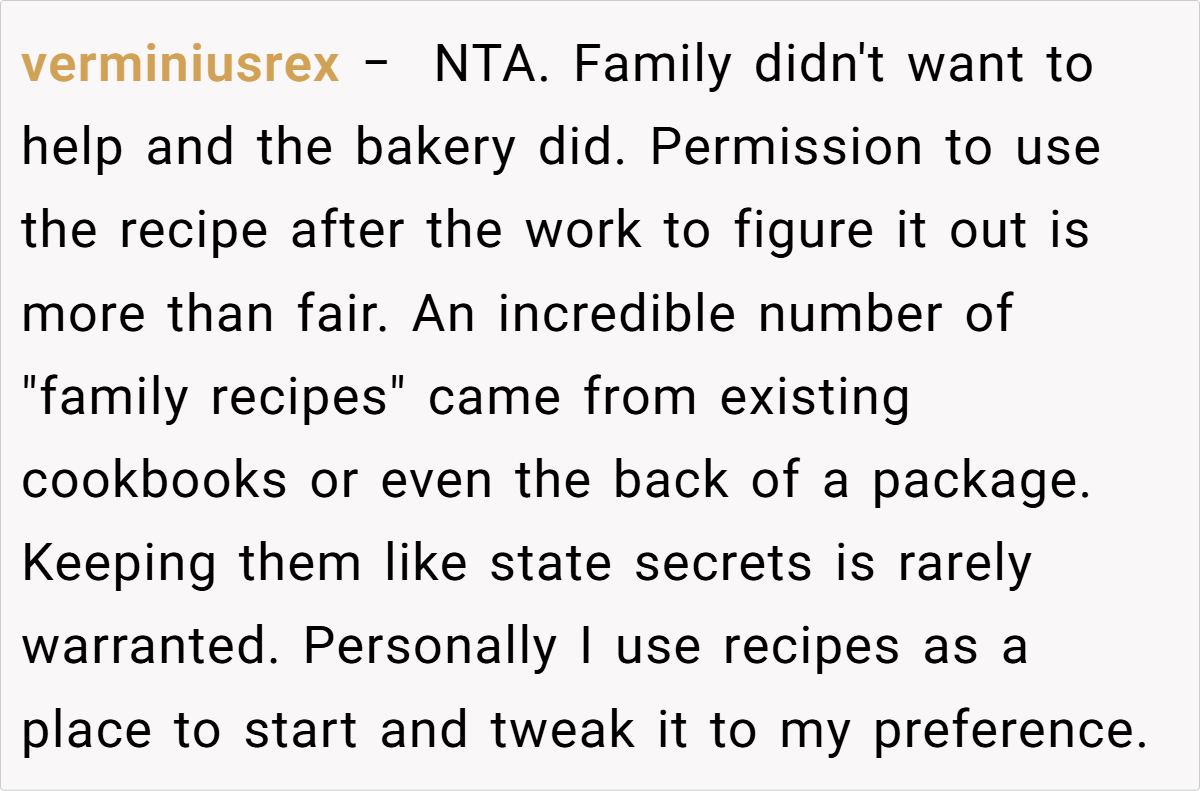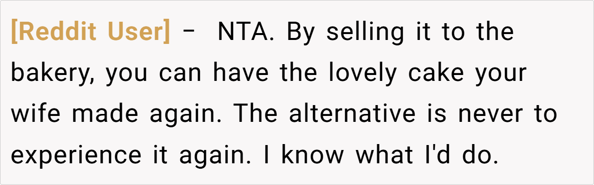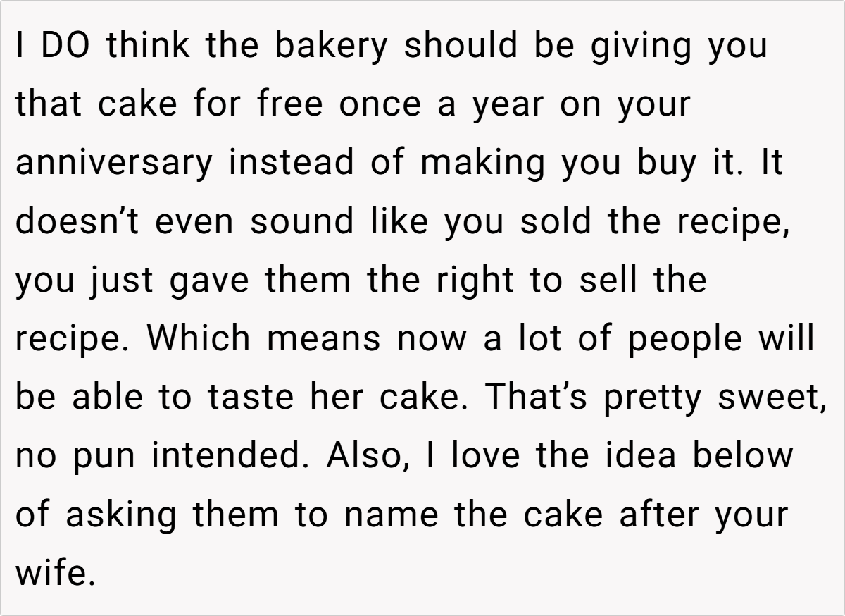 The Reddit community largely sided with him. One user remarked, “I’d think of this as a way for your wife to live on in what she created—it’s not about money, it’s about preserving her memory.” Another pointed out that if his children never wanted to figure out the recipe, then his choice to have the bakery perfect it is perfectly reasonable. Some commenters emphasized that the exchange wasn’t a sale in the cold, mercantile sense but rather a trade—permission to use the recipe in return for reviving a cherished memory.