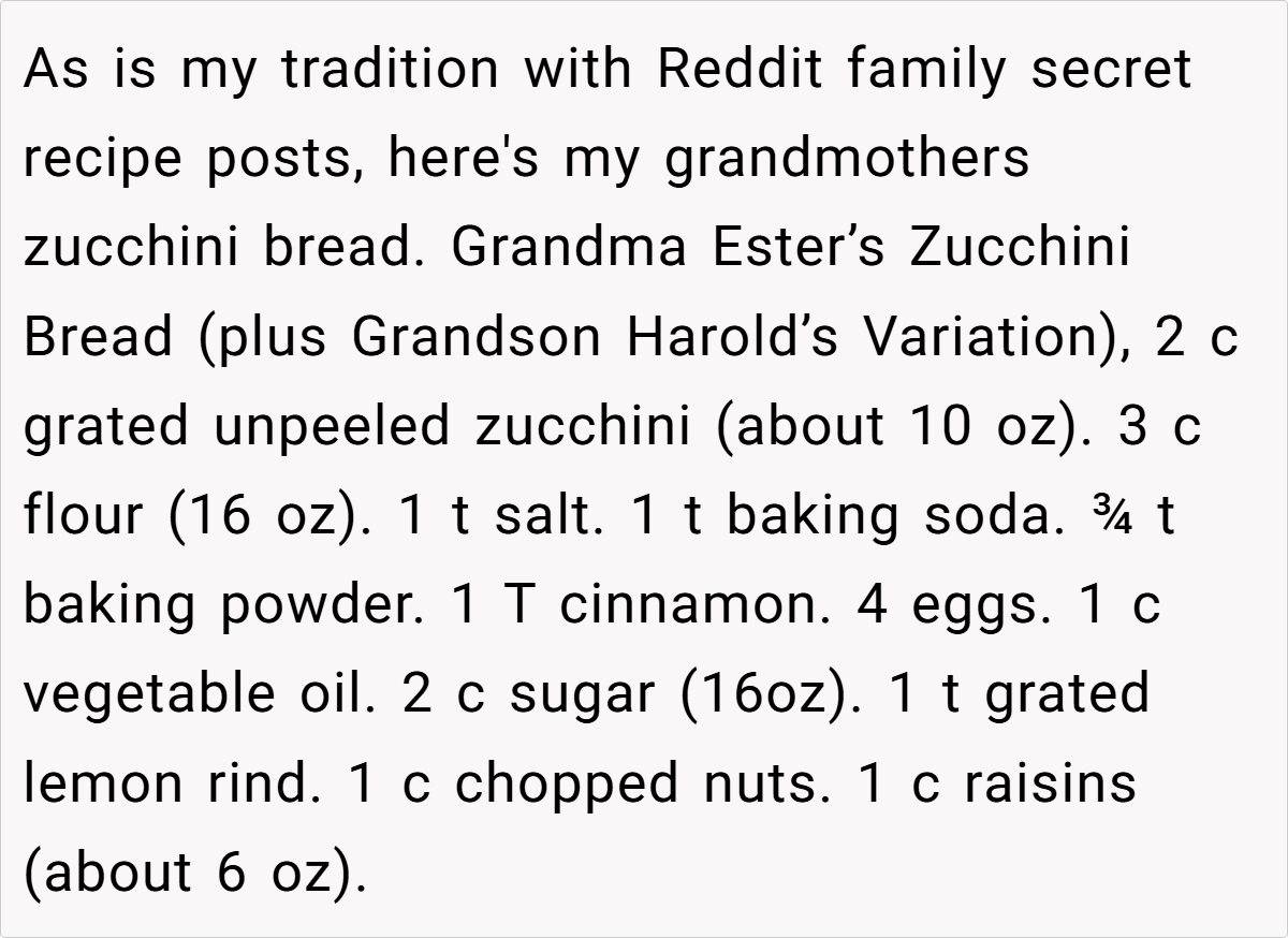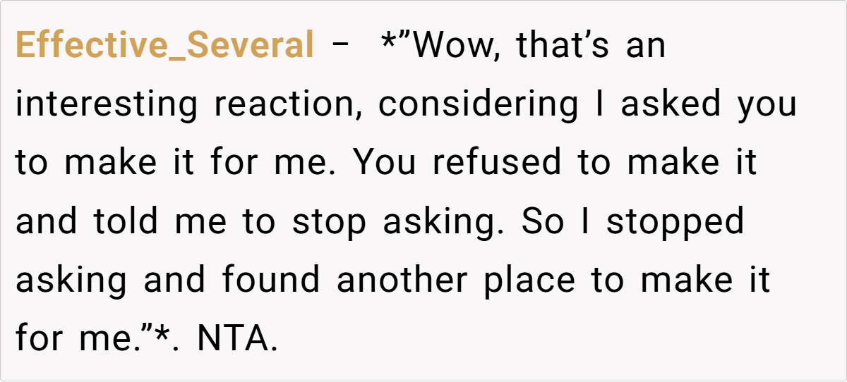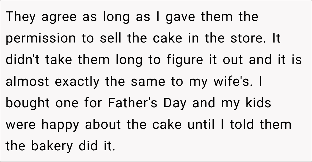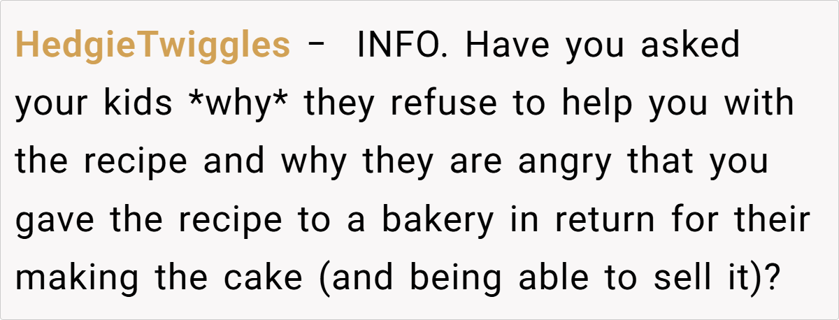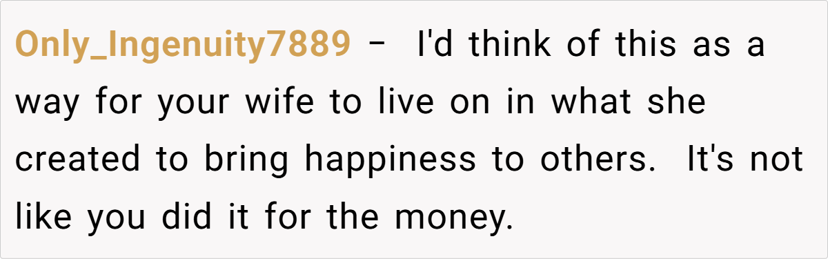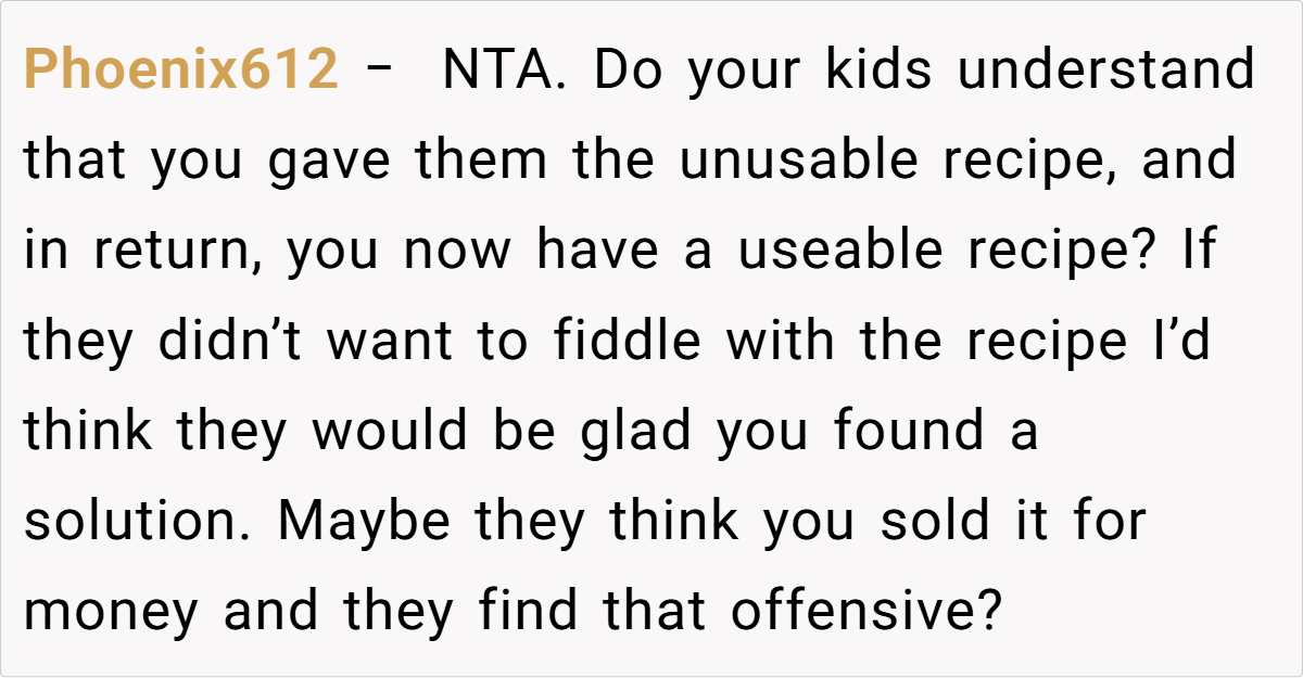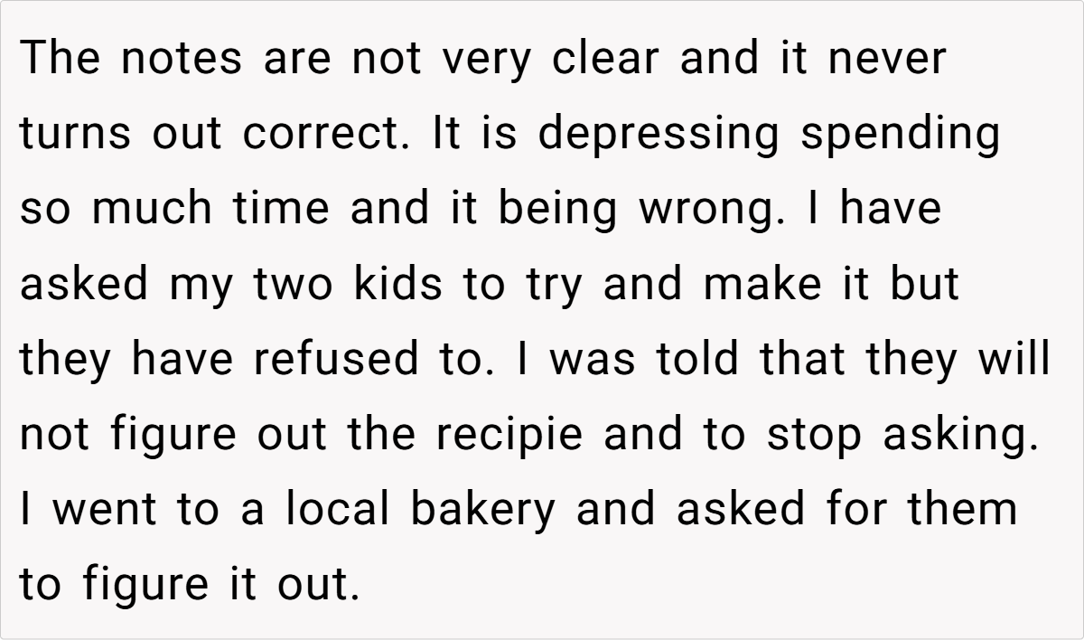 The Reddit community largely sided with him. One user remarked, “I’d think of this as a way for your wife to live on in what she created—it’s not about money, it’s about preserving her memory.” Another pointed out that if his children never wanted to figure out the recipe, then his choice to have the bakery perfect it is perfectly reasonable. Some commenters emphasized that the exchange wasn’t a sale in the cold, mercantile sense but rather a trade—permission to use the recipe in return for reviving a cherished memory.