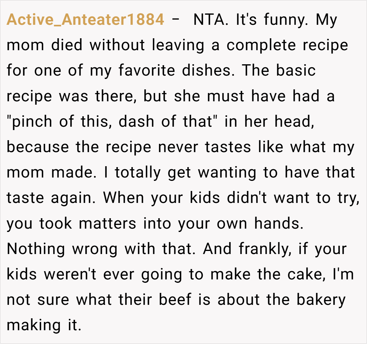A few voices suggested that his children might be projecting their own grief or fear of losing a personal connection with their mother, rather than reacting solely to a business decision. Overall, the consensus was that he’s not the jerk here; he simply found a way to bring back something he dearly misses, ensuring her cake isn’t forgotten.