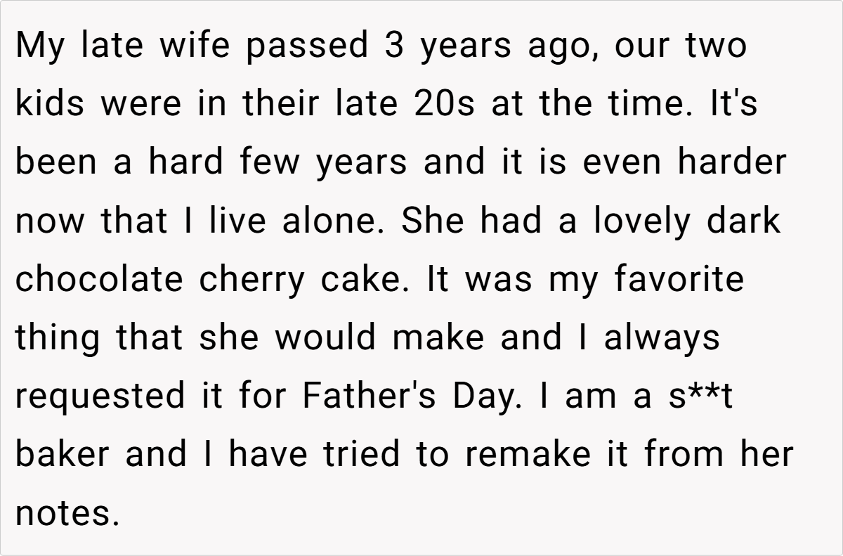 Losing a loved one leaves behind not just a void, but also a tapestry of cherished memories—smells, flavors, and the little traditions that made life so sweet. For one father, the memory of his late wife lives on in a signature dark chocolate cherry cake that she used to lovingly bake for Father’s Day.