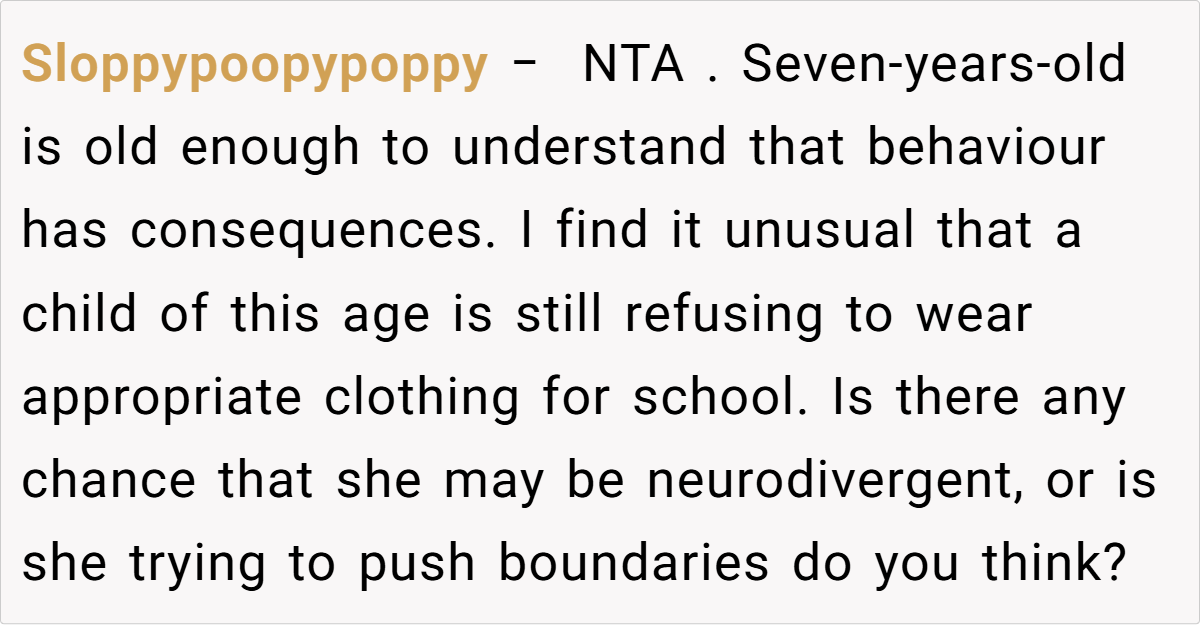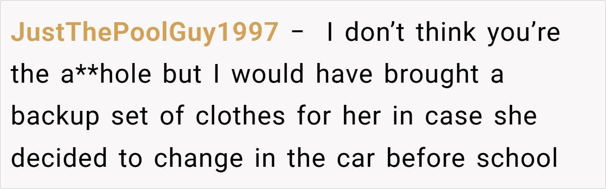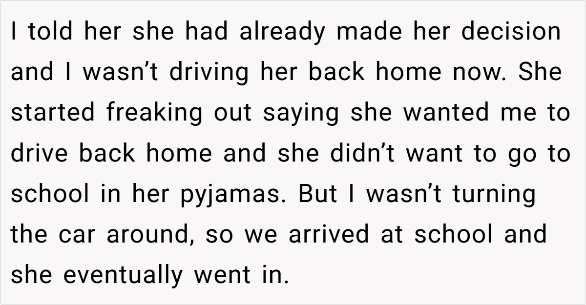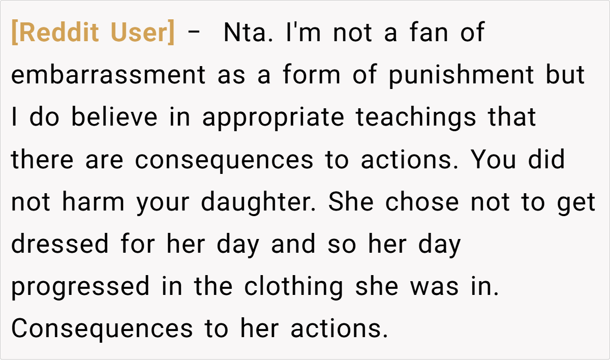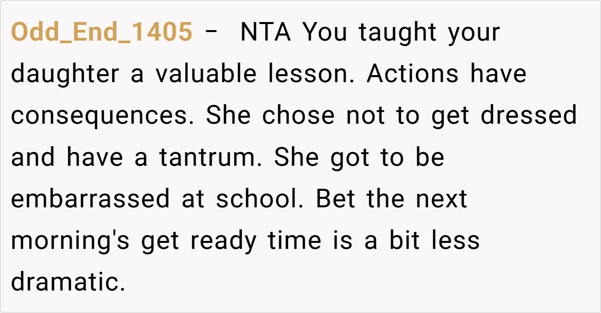 However, a significant number also criticized the decision as a harsh lesson for a young child, arguing that it risked undermining her confidence and sense of routine. Overall, the consensus urged for a balanced approach that prioritizes both immediate peace and long-term emotional well-being