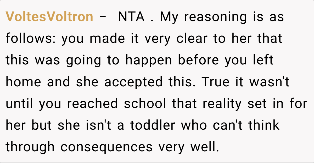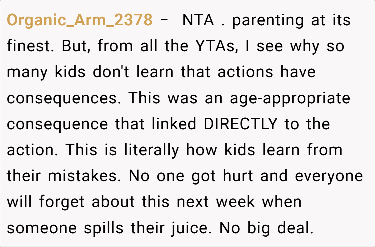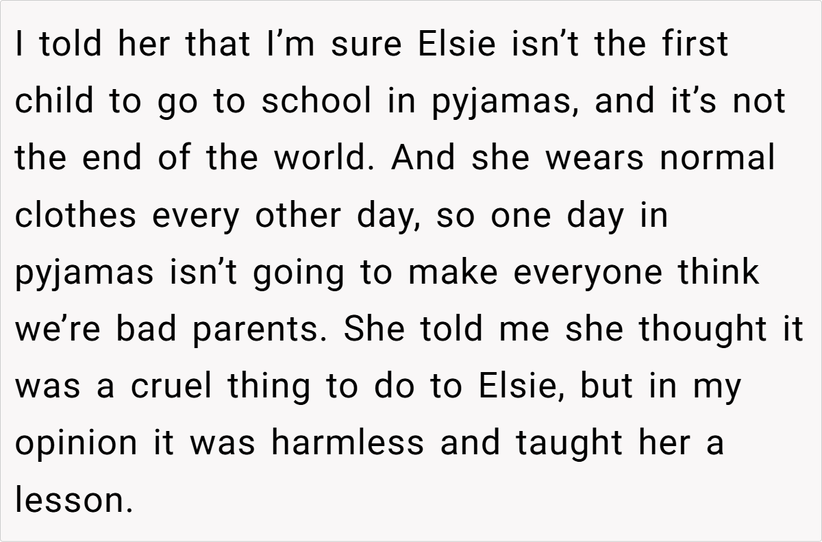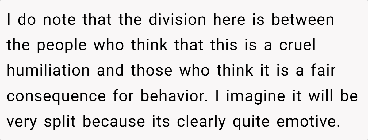However, a significant number also criticized the decision as a harsh lesson for a young child, arguing that it risked undermining her confidence and sense of routine. Overall, the consensus urged for a balanced approach that prioritizes both immediate peace and long-term emotional well-being