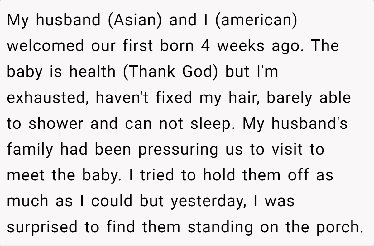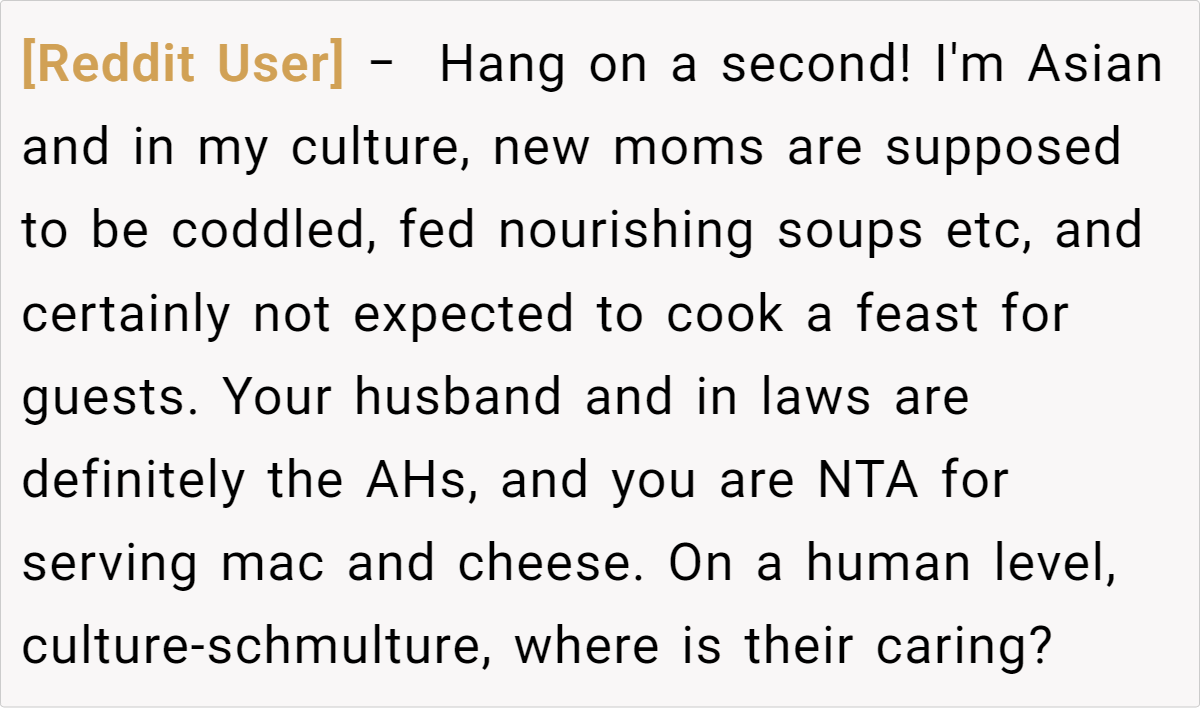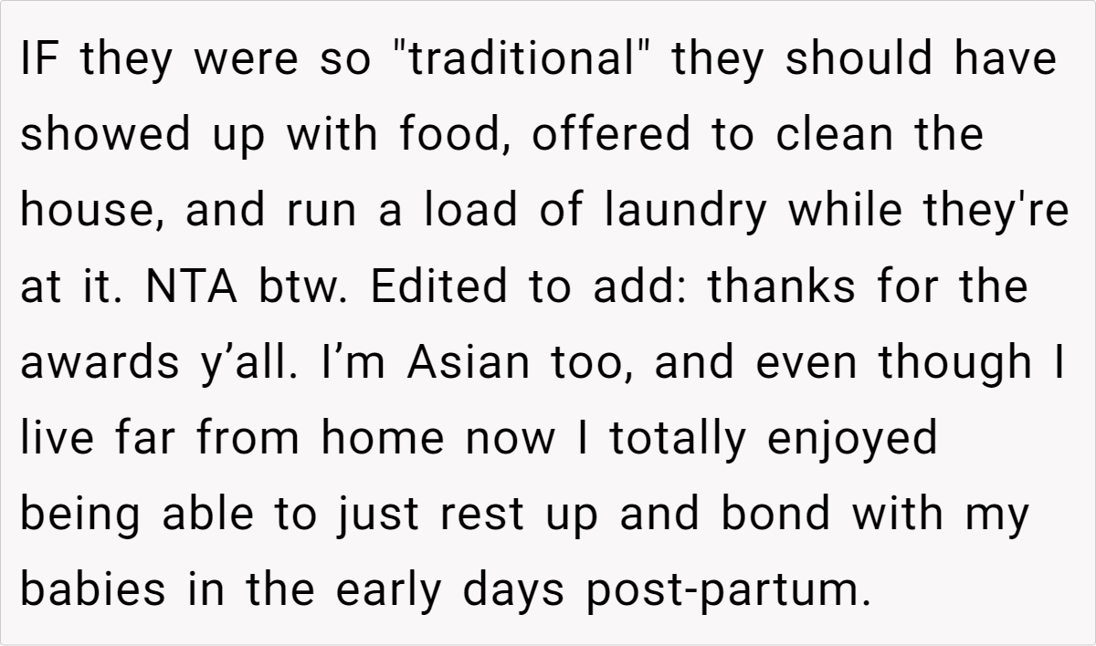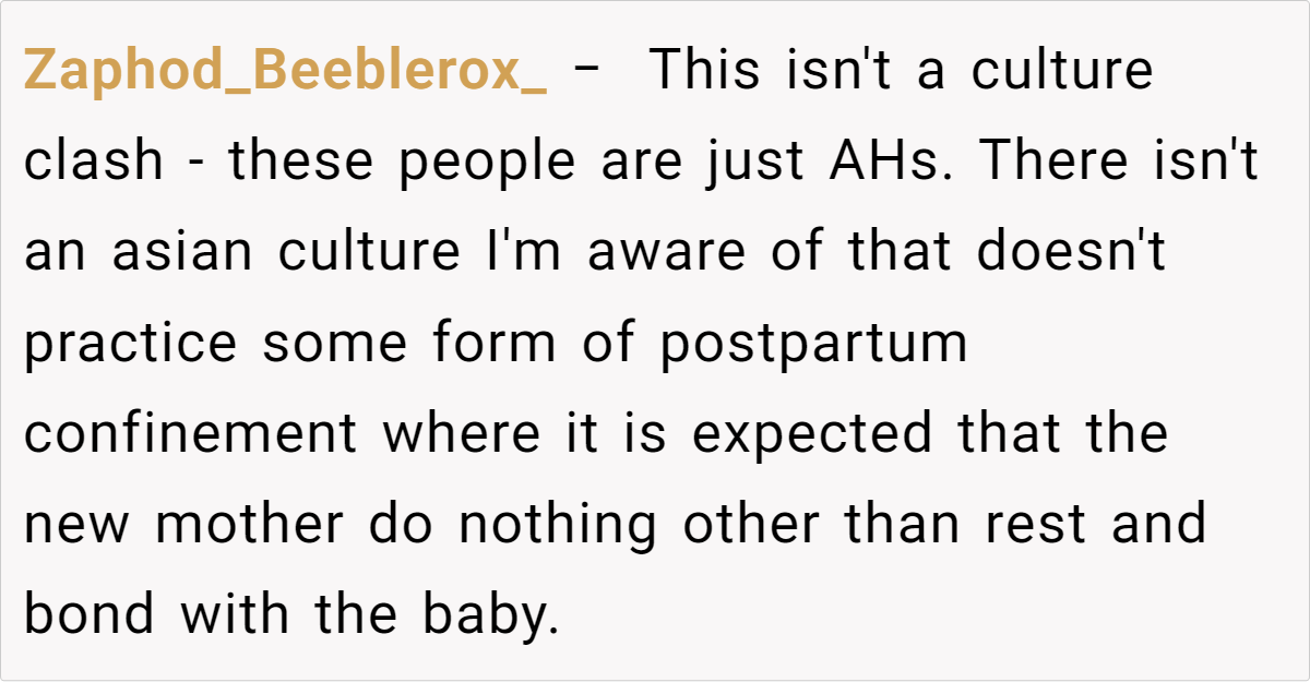 Especially in some Asian cultures, postpartum rest is a highly respected period known colloquially as “confinement,” where the mother’s priority is to heal, rest, and bond with the baby. Typically, extended family members are expected to help by bringing food and providing emotional support. In this story, it appears that cultural courtesy was flipped on its head, with the new mom taking on unexpected hosting duties while still recovering.