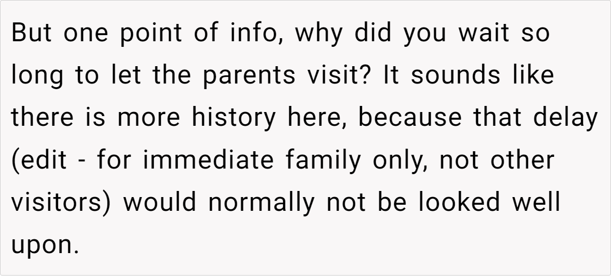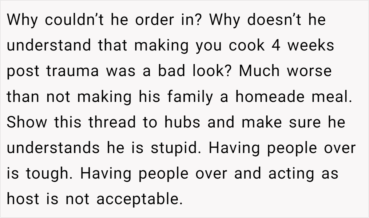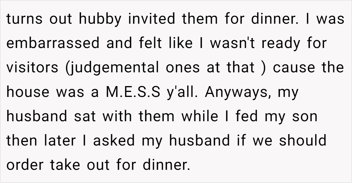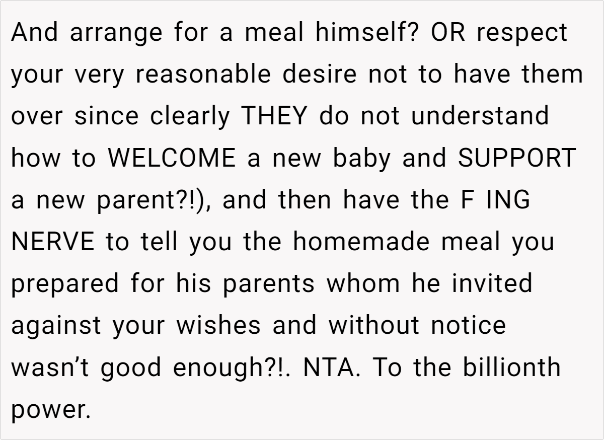 Especially in some Asian cultures, postpartum rest is a highly respected period known colloquially as “confinement,” where the mother’s priority is to heal, rest, and bond with the baby. Typically, extended family members are expected to help by bringing food and providing emotional support. In this story, it appears that cultural courtesy was flipped on its head, with the new mom taking on unexpected hosting duties while still recovering.