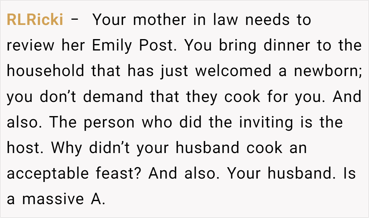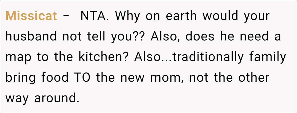 At the end of the day, feeding a new mom should be the priority, not the other way around. Perhaps a side of empathy and open communication would have satisfied all parties better than any gourmet feast. Have you ever faced a similar predicament of cultural expectations and family drama? We’d love to hear your take—drop a comment below and let us know what you would do in this situation!