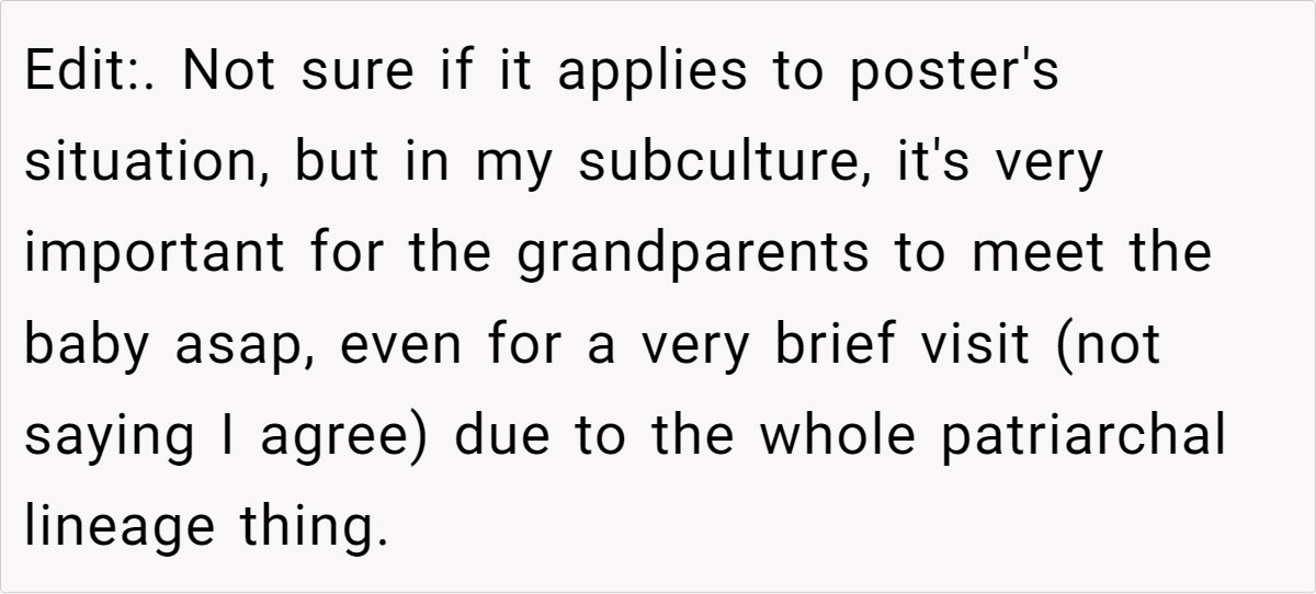 This situation also touches upon the common issue of “post-baby” relationship stress: The spouse, in trying to please his family, seemingly overlooked his wife’s exhaustion. Such an approach can unintentionally undermine a new mother’s already fragile sense of stability. Mutual understanding becomes paramount. While cultural customs and traditions are important, they need to intersect with realistic support for a mother who’s barely had time to shower or catch a full night’s rest.