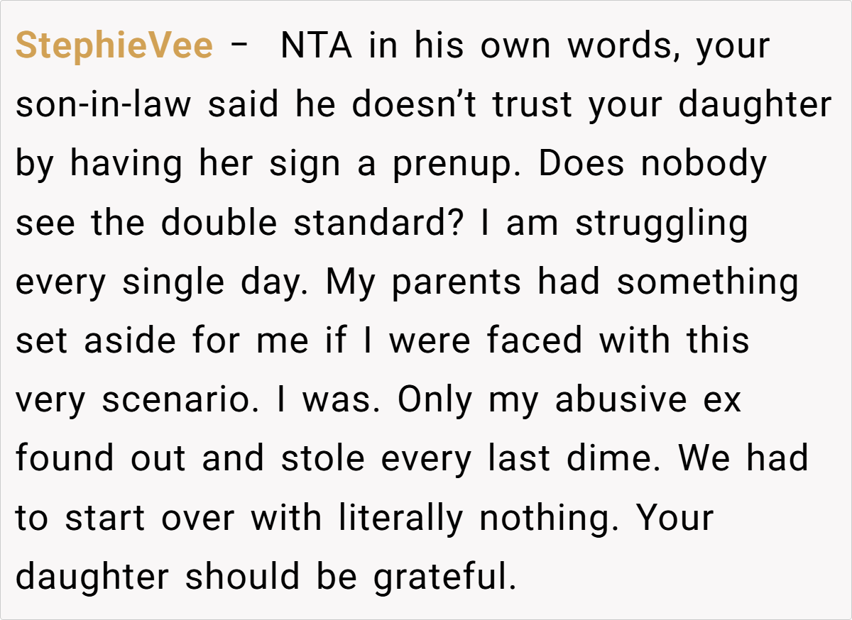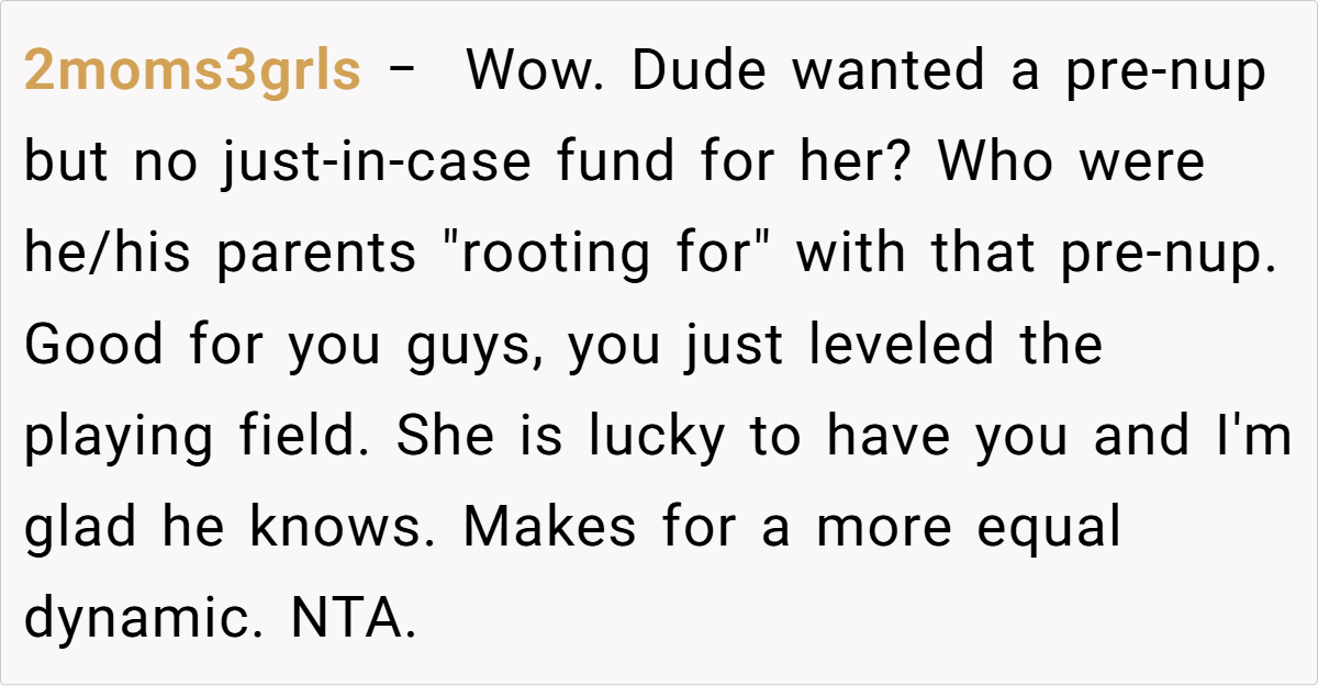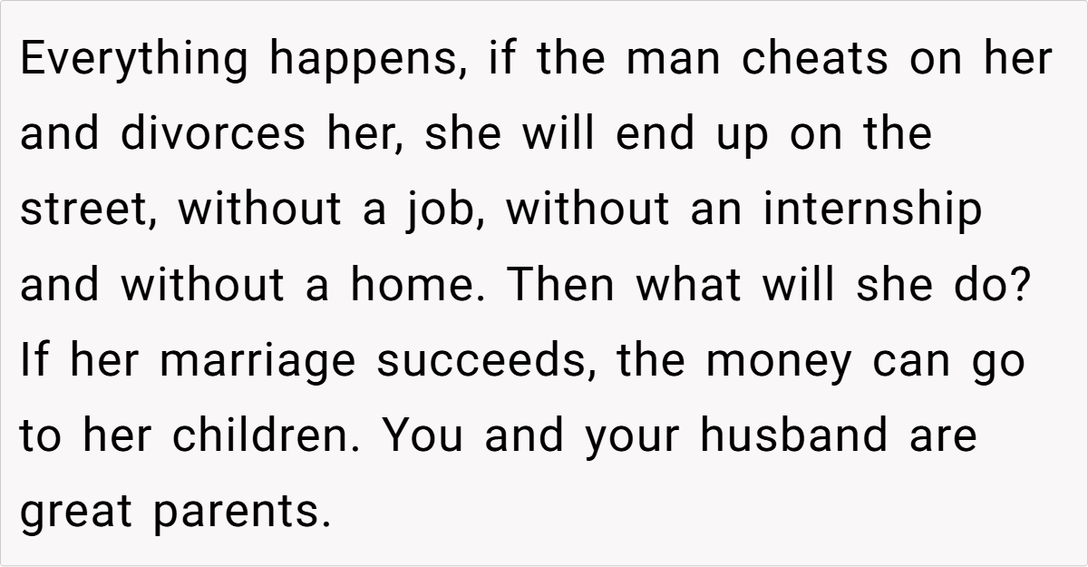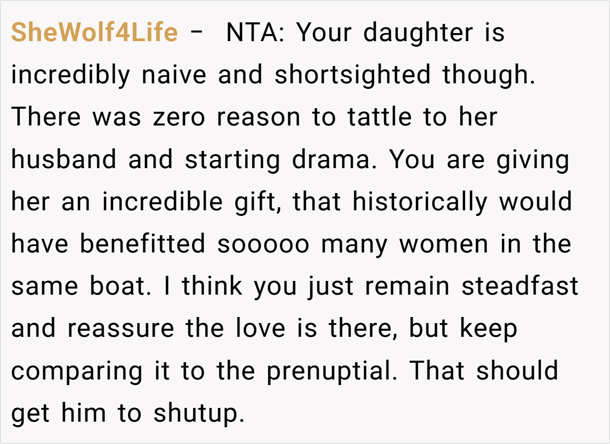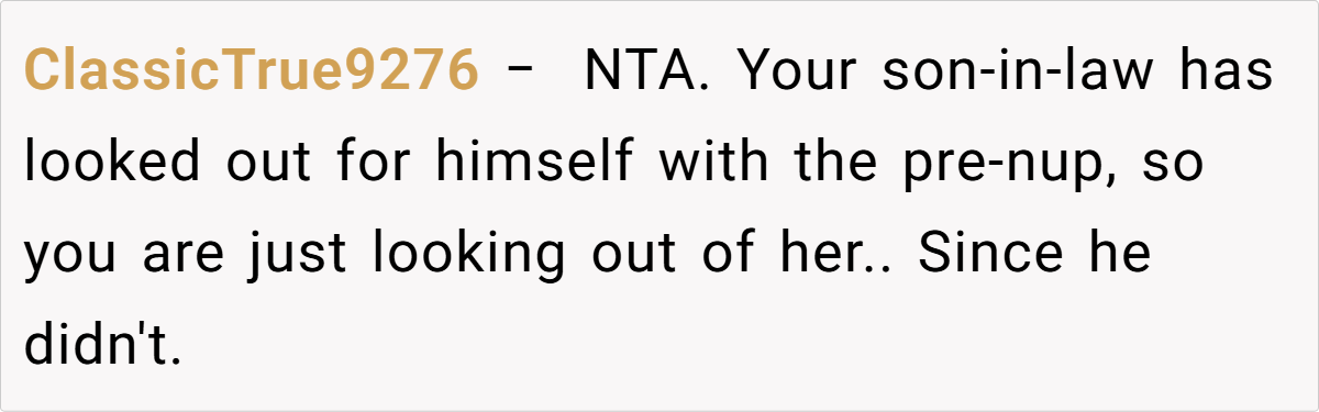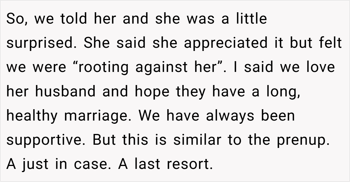In this situation, the daughter—who has chosen to be a stay-at-home mom and has signed a prenup limiting her potential settlement—is being given a financial safety net to help secure her future if the marriage should fail. Experts point out that measures like prenups and reserve funds are standard practices meant to safeguard against unforeseen challenges, not to predict or encourage divorce.