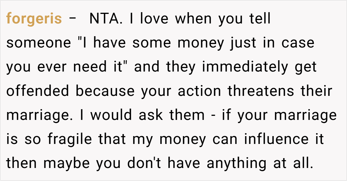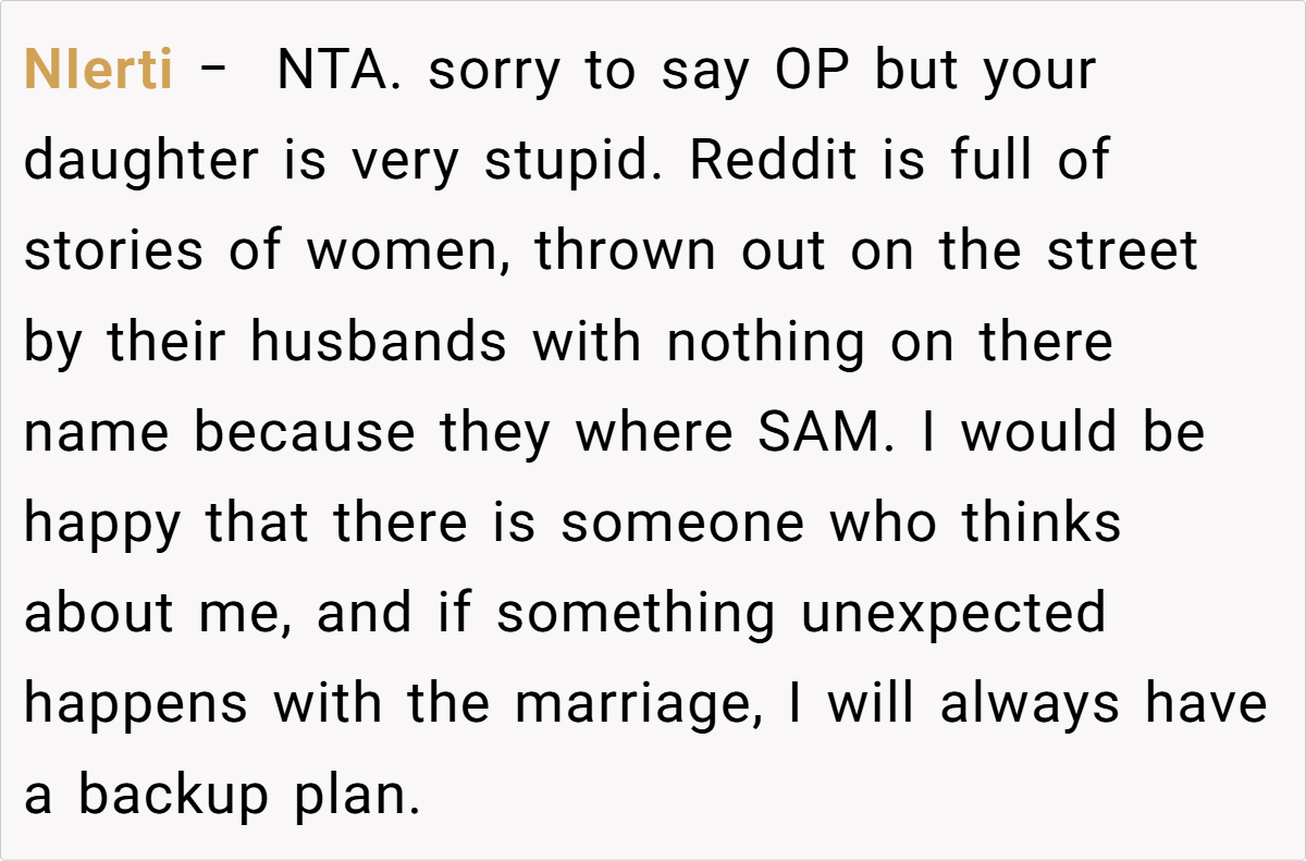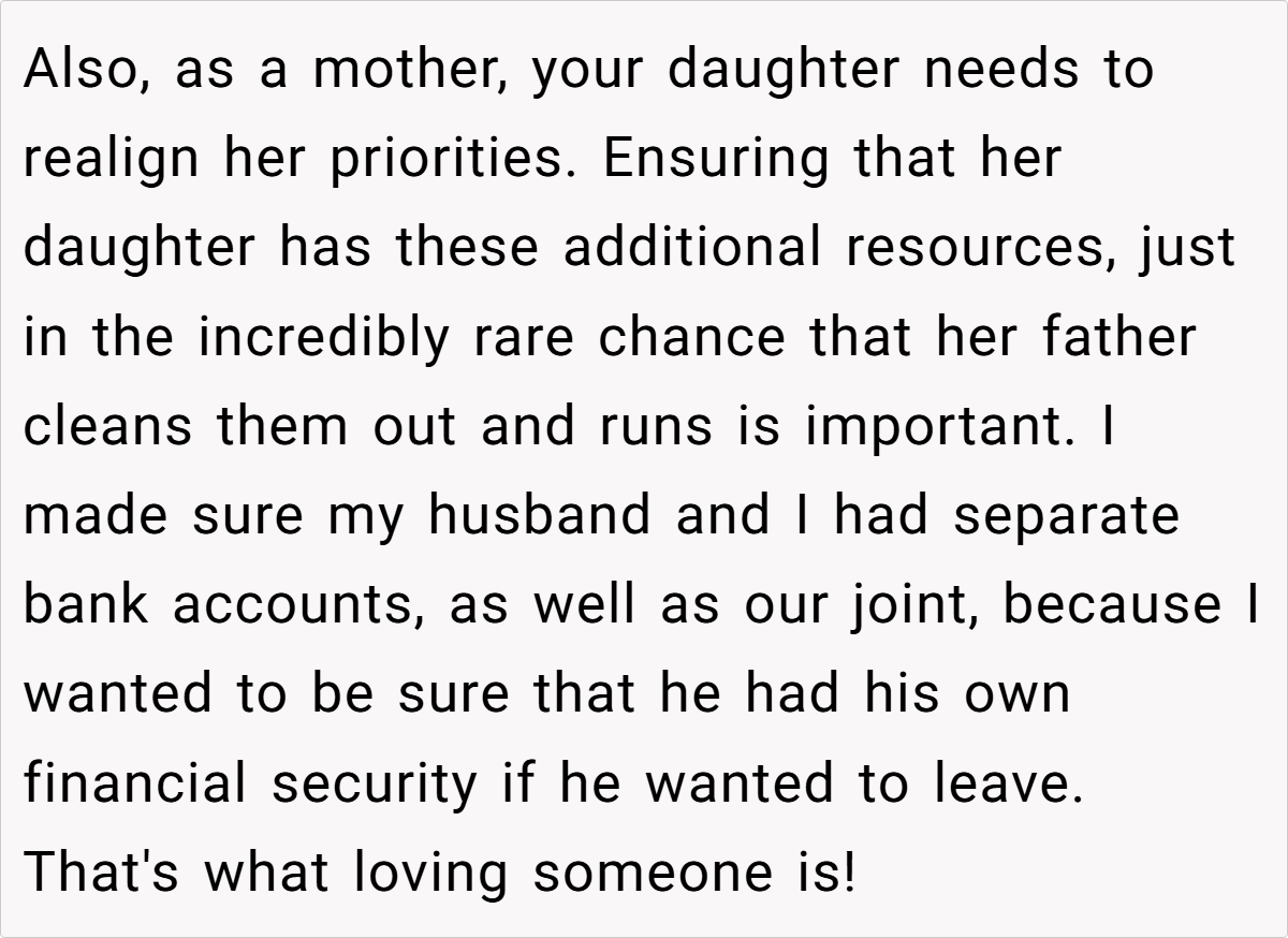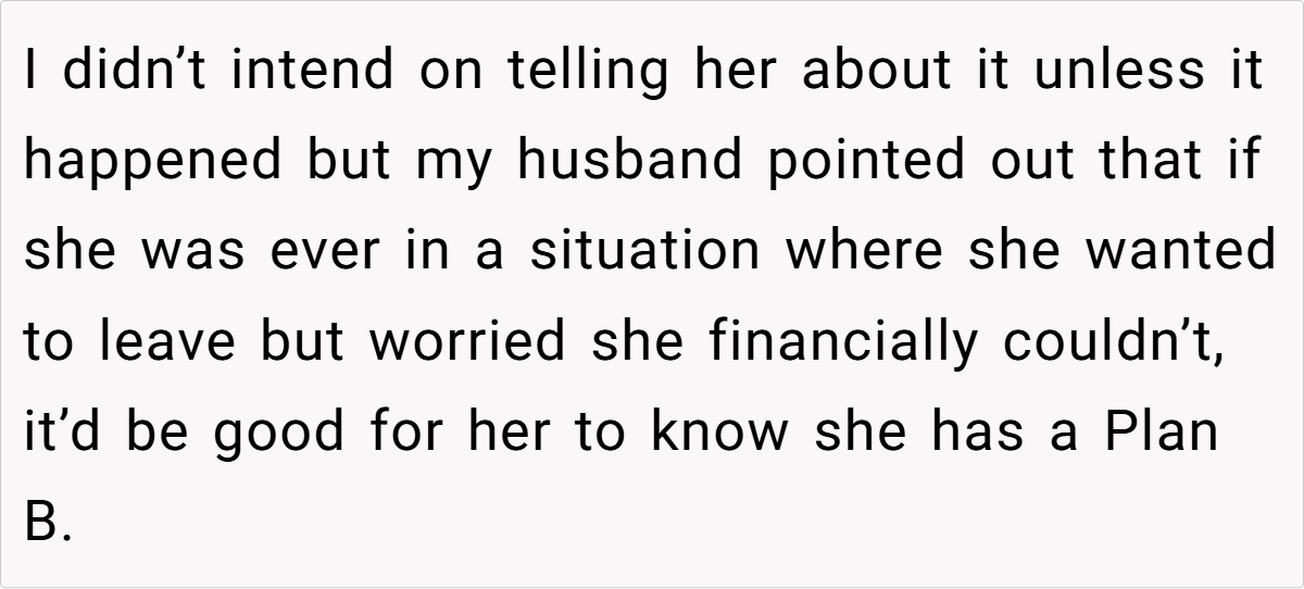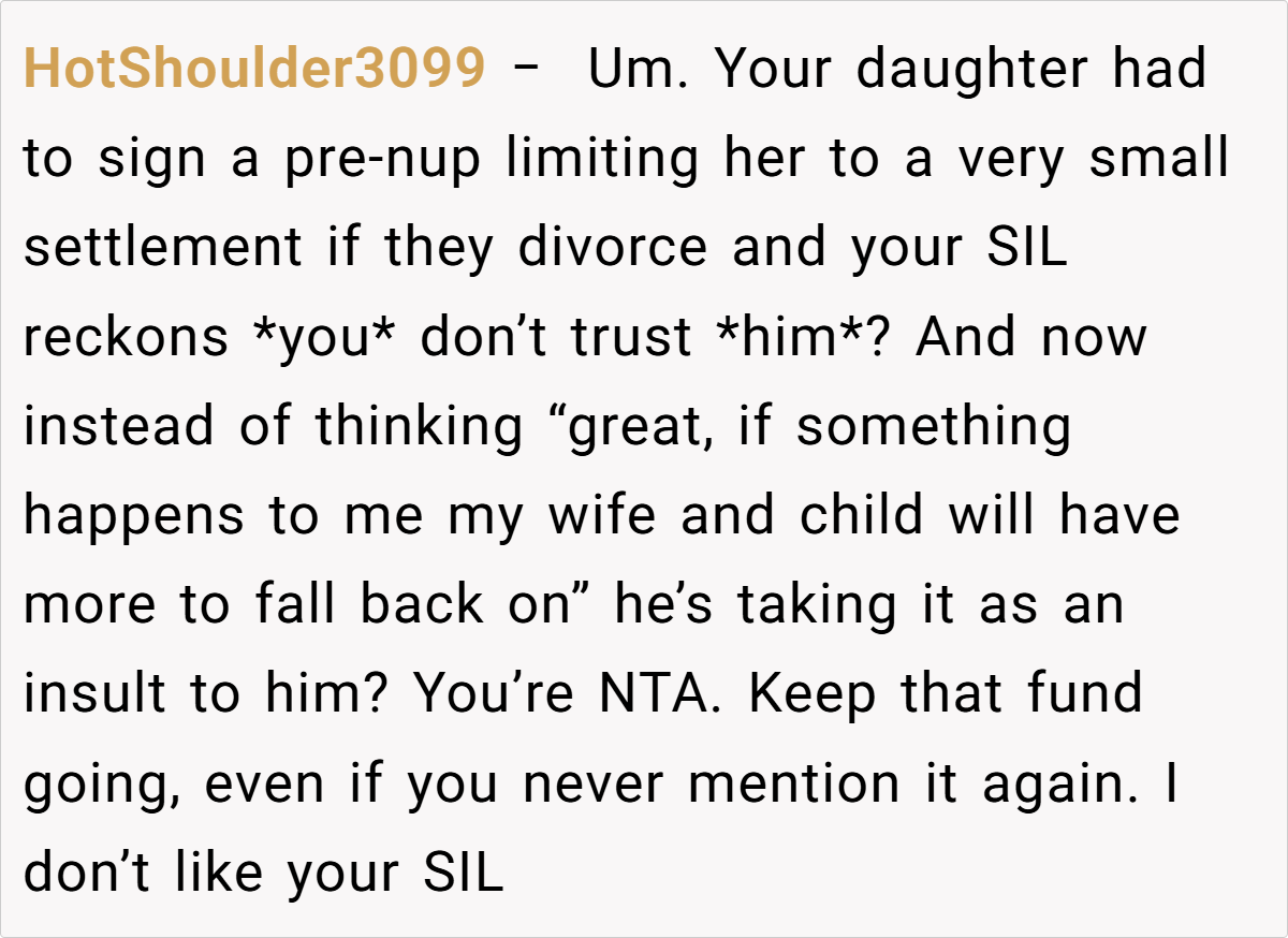 Some commenters note that while the fund is a smart safety net, the way it was introduced might have inadvertently hurt the daughter’s feelings. There’s a recurring theme: parents must balance financial prudence with fostering trust and confidence within the family.