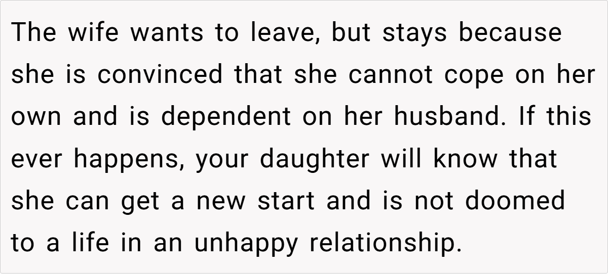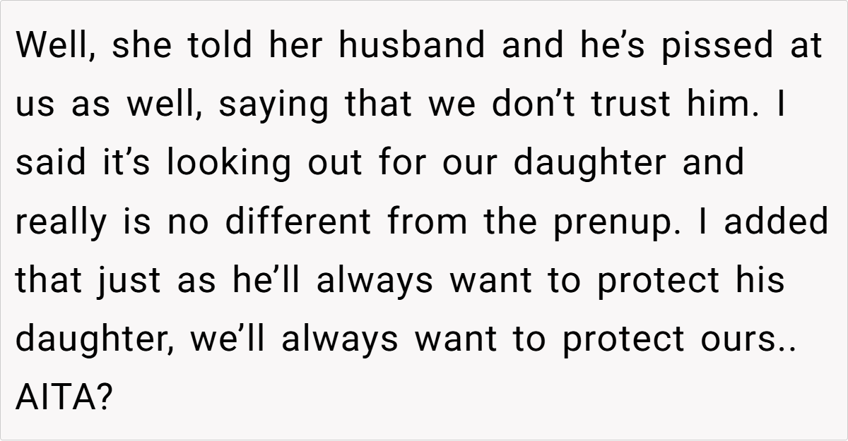 The daughter, however, feels that this move is akin to “rooting against her,” and her husband is furious, interpreting the fund as a sign of distrust. This situation brings up difficult questions about balancing prudence with trust in family relationships.
