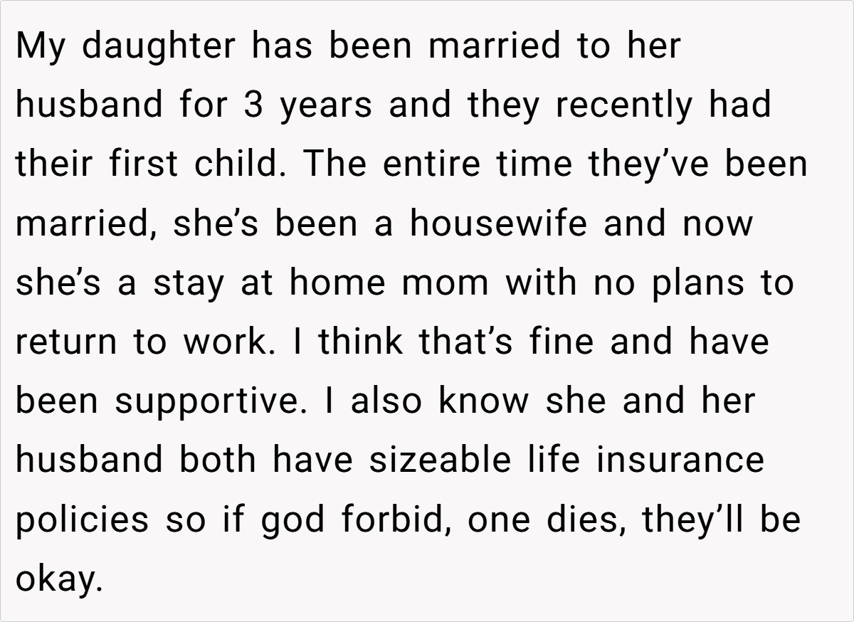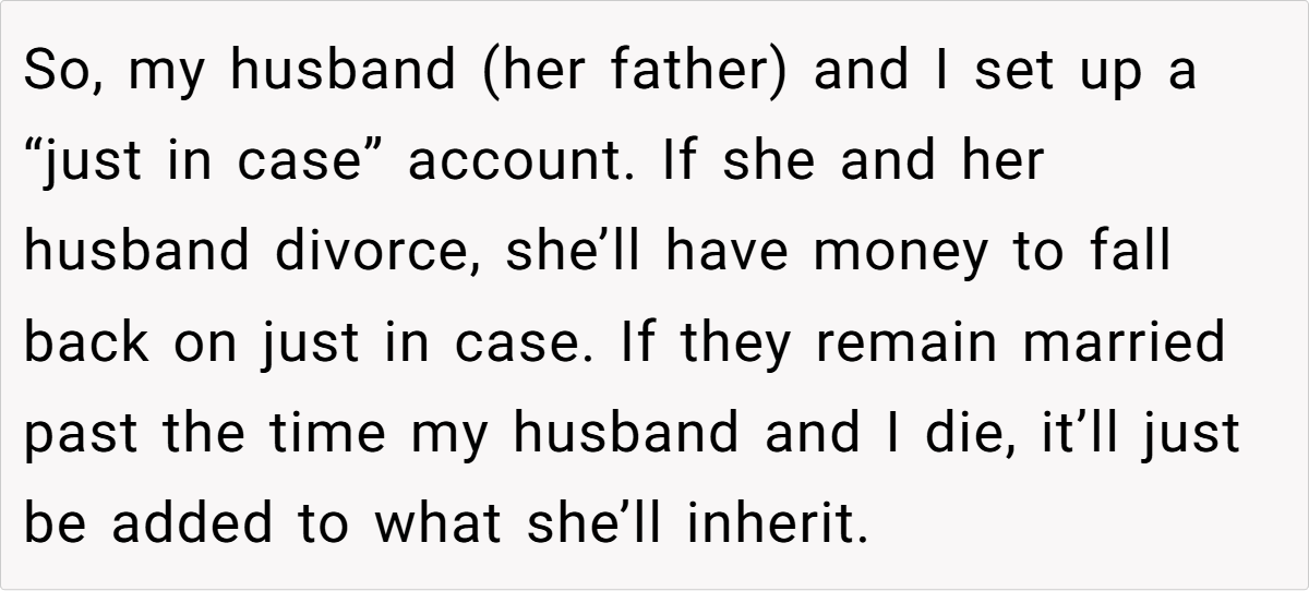 When it comes to protecting our loved ones, especially in unpredictable life circumstances, parents often go to great lengths to ensure their children’s financial and emotional security. In this story, a set of well-intended parents has established a “just in case” fund for their daughter—a stay-at-home mom who recently had her first child—so that she has a financial safety net in the event of a divorce.
