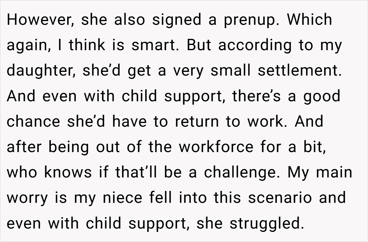 Given that past family experiences have shown that even with support systems like child support and insurance, financial hardship can occur, this backup plan is designed solely to protect the daughter’s well-being. Ultimately, the intention is not to undermine trust in the marriage but to provide a safety net that reinforces long-term security, much like a prenup does.