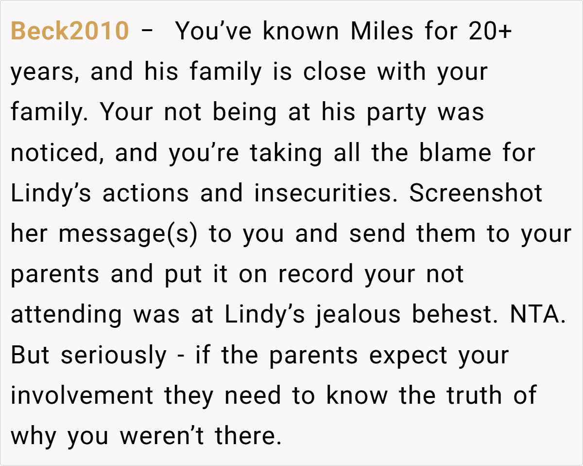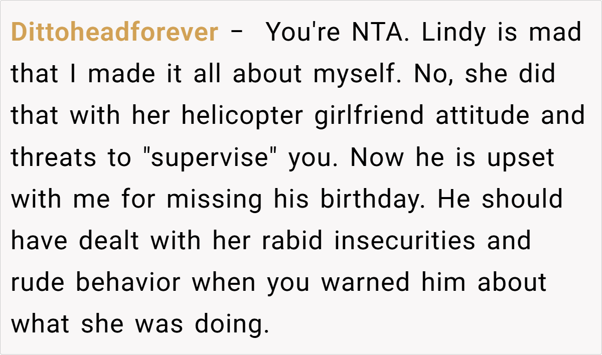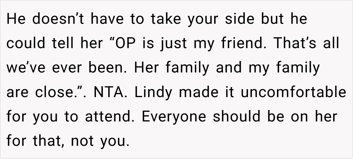 The Reddit community overwhelmingly supports the OP’s stance. Many commenters argue that the discomfort isn’t rooted in her behavior but in Lindy’s own insecurities. They point out that a childhood photo should evoke fond memories rather than be weaponized to assert control. The consensus is that skipping the birthday party was a reasonable step to avoid further conflict. Ultimately, the community feels that long-time friendships deserve respect—and that undue jealousy has no place in healthy relationships.