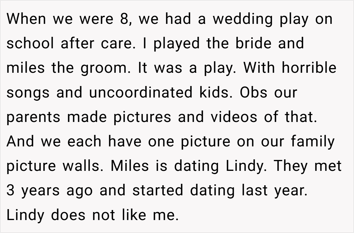 Ever since childhood, some bonds seem unbreakable—even if they evolve into something different over time. For one woman, a playful wedding play from her early years has unexpectedly reemerged as a source of tension in her adult life. What began as an innocent school play, immortalized in a cherished family photo, has now become a flashpoint for jealousy, stirring feelings that neither party anticipated.