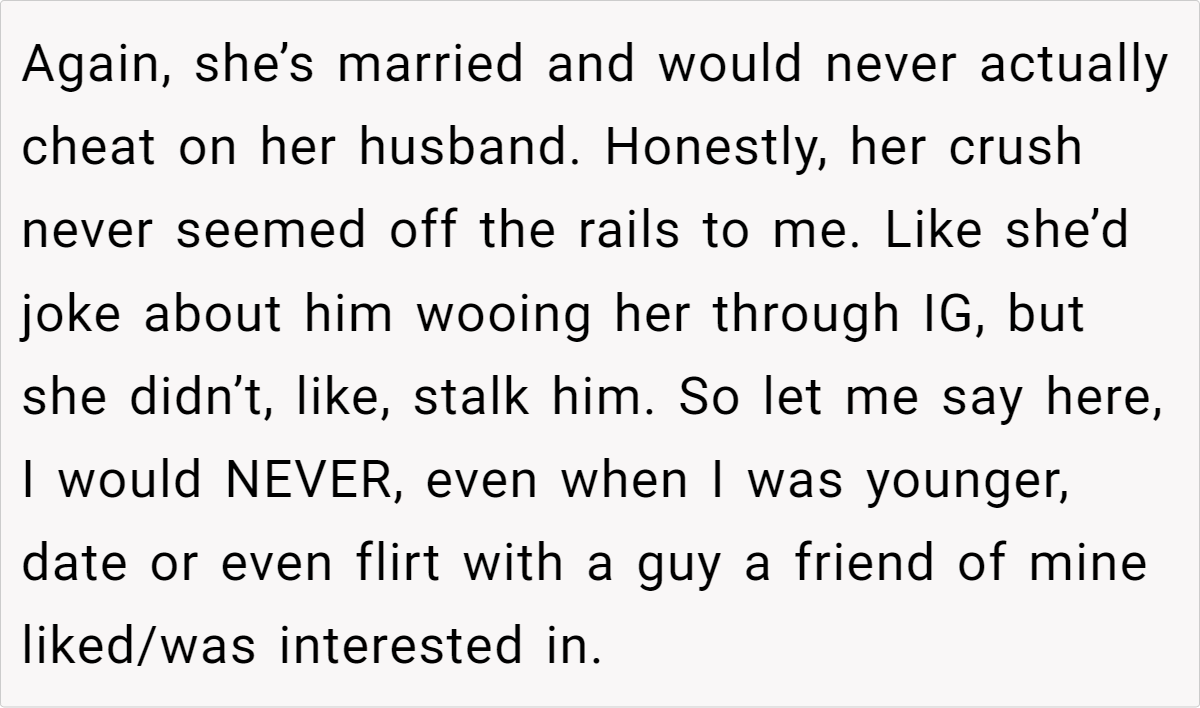 In this case, while OP’s actions might not be considered a traditional betrayal, they did disregard her friend’s feelings and potentially undermine their friendship. Even though the friend’s crush on the musician was purely hypothetical, it held emotional significance for her. OP’s decision to sleep with him, while not malicious, disregards this emotional connection and demonstrates a lack of consideration for her friend’s perspective.