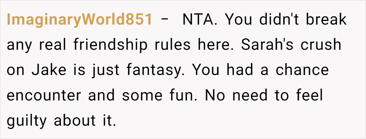 So, dear readers, what’s your verdict? Is OP the a-hole for sleeping with her friend’s “hall pass” crush? Or is her friend overreacting to a harmless encounter? How can we better navigate boundaries and respect our friends’ feelings, even when our own desires conflict with their emotional attachments? Share your thoughts and experiences in the comments below!