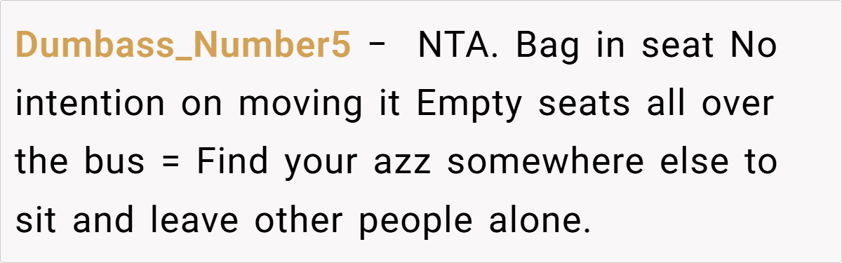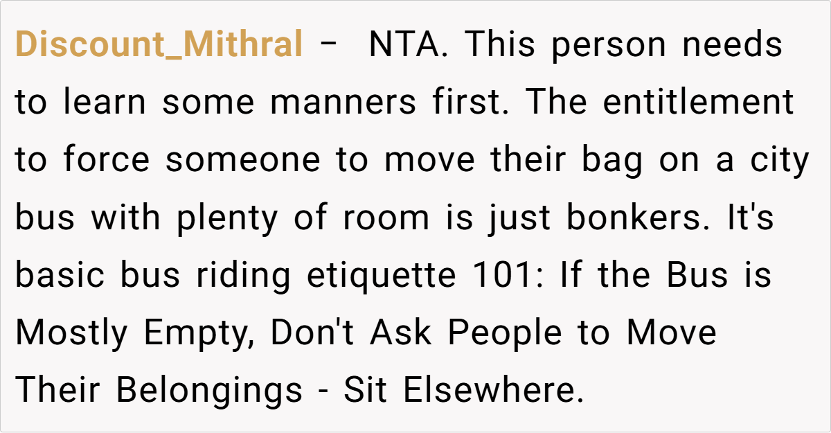 The Reddit community largely echoes a common sentiment: the redditor did nothing wrong. Many users agree that with so many empty seats available, choosing to reserve a space for personal belongings is entirely acceptable. While some humorously highlight the absurdity of being forced to share, others emphasize that the incident reflects a broader societal misunderstanding about personal space on public transit. The consensus is clear—when buses are sparse, your little sanctuary is yours to enjoy.