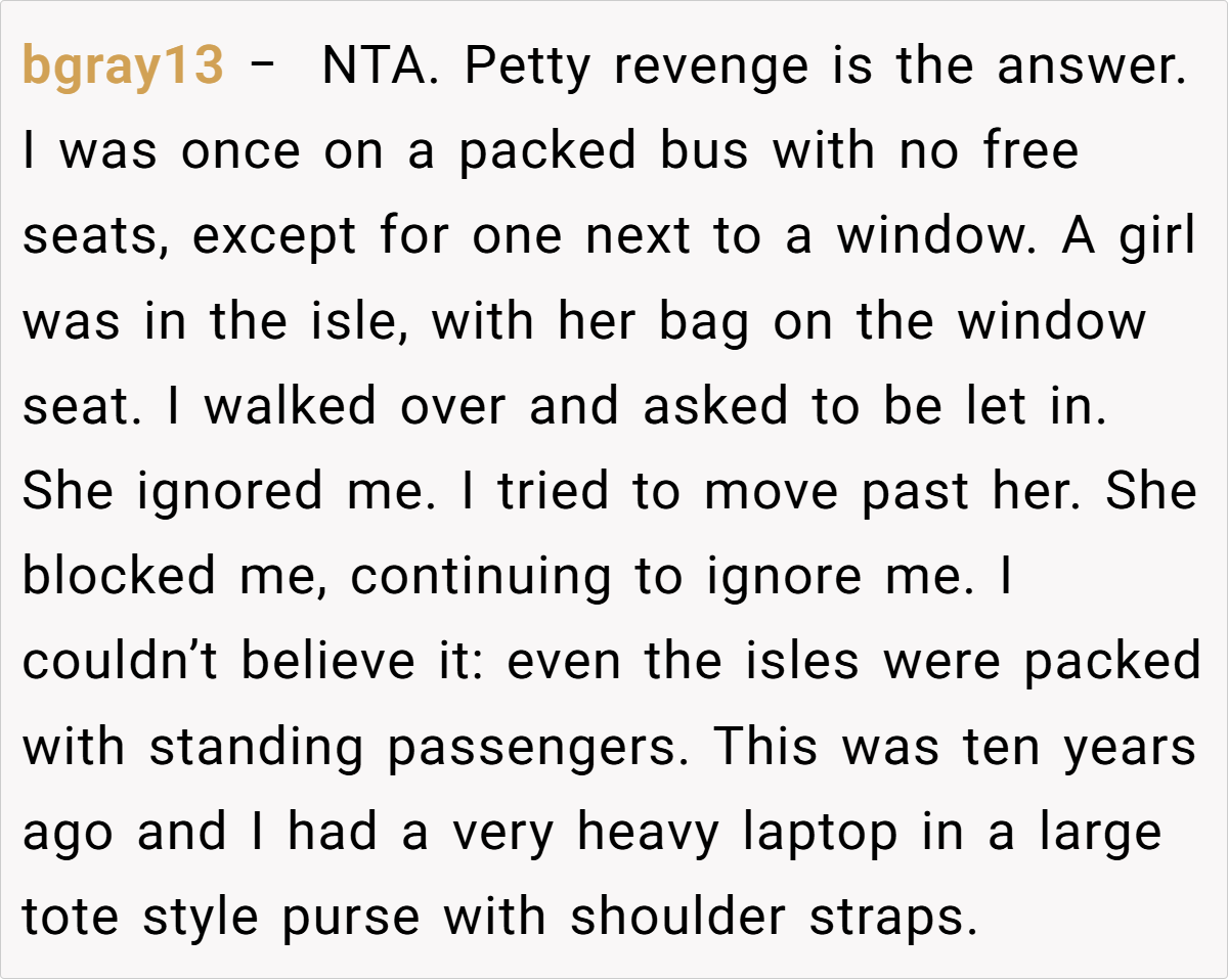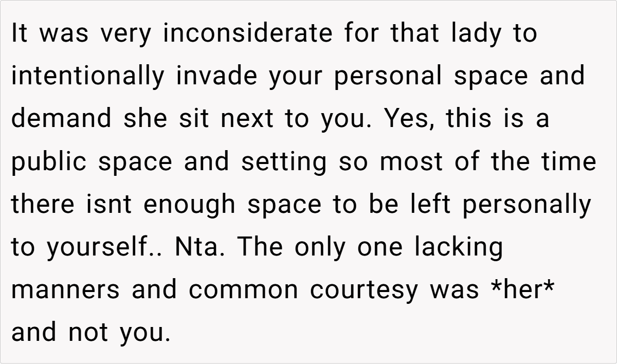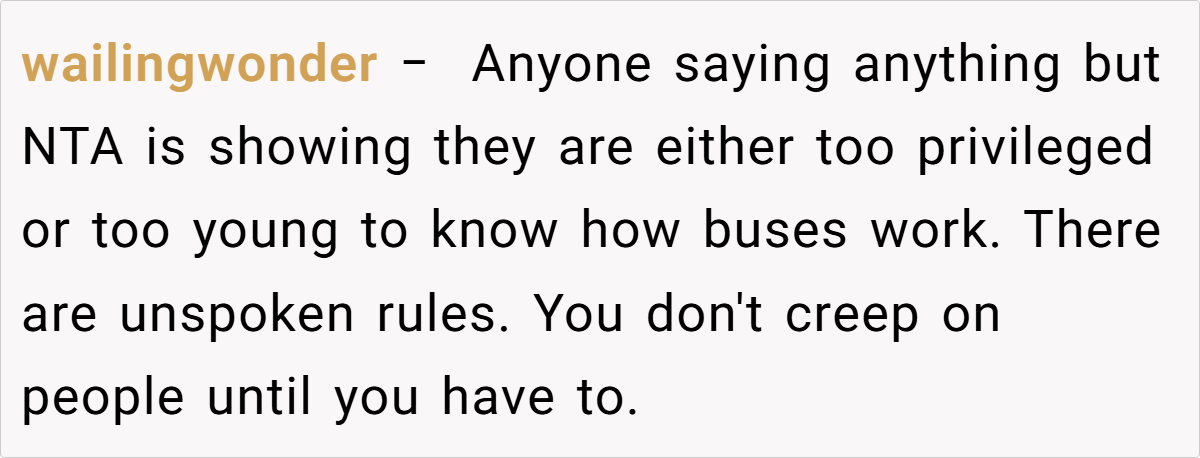 As the bus meandered through city streets, the redditor’s quiet desire for a little extra space was abruptly challenged by a stranger’s insistence on reclaiming what she saw as shared seating. This clash of perspectives invites us to explore not only the individual nuances of bus etiquette but also the broader dynamics of public behavior in communal spaces.