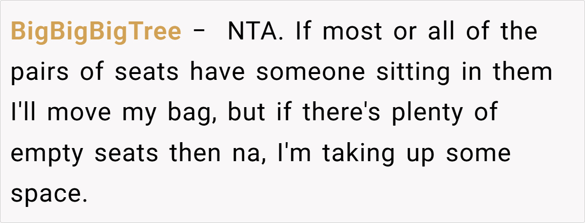 The redditor’s dilemma stems from a simple act: choosing to keep a cherished personal space intact by placing a bag on an adjacent seat. In a nearly empty bus, the intent was never to exclude or offend. Yet, for the other passenger, the act was interpreted as an imposition on communal norms. This divergence in perception underscores how our actions in public spaces are often laden with unspoken expectations, leading to conflicts that can feel disproportionate to the original act.
