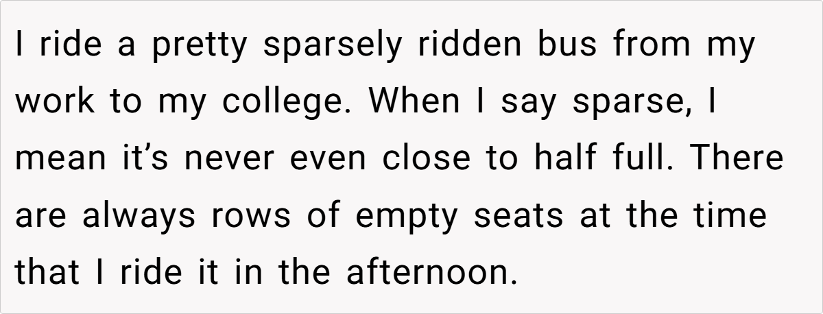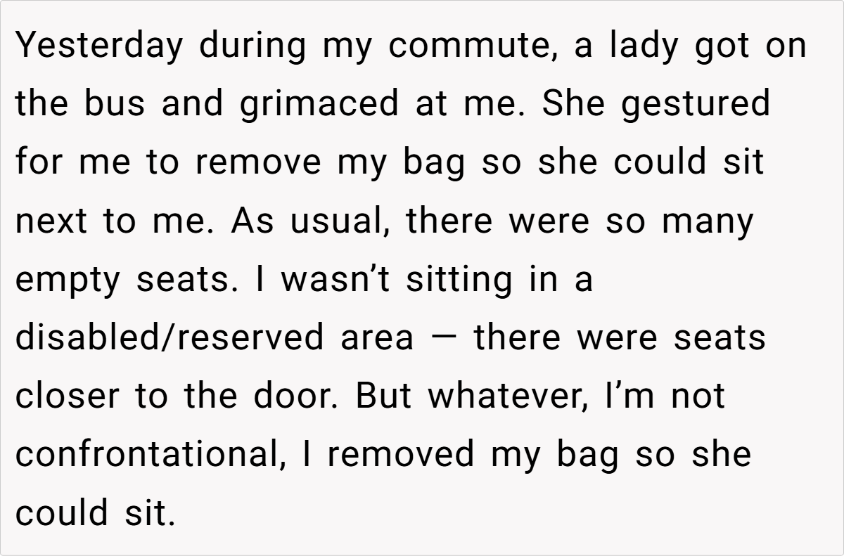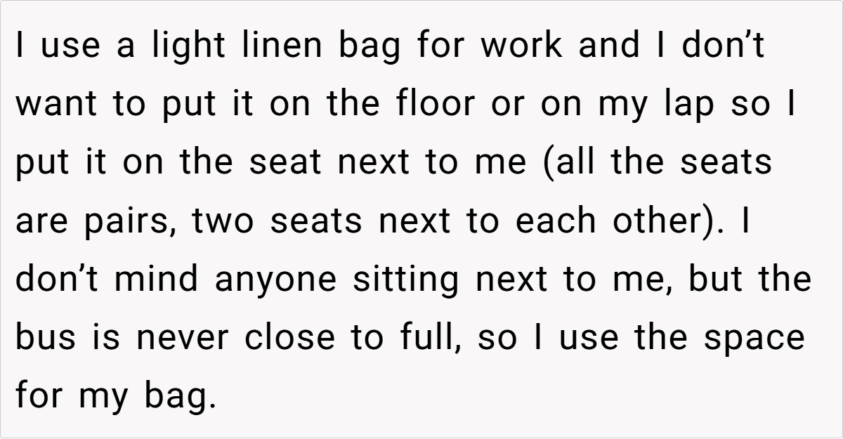 On a seemingly ordinary afternoon bus ride from work to college, one redditor’s simple choice of seating sparked an unexpected public confrontation. The story unfolds aboard a nearly empty bus—a rare quiet refuge in the hustle of daily transit—where personal comfort meets unspoken social rules. A light linen bag, intended merely as a harmless accessory, becomes the center of an etiquette debate that leaves one commuter feeling misunderstood and unfairly judged.