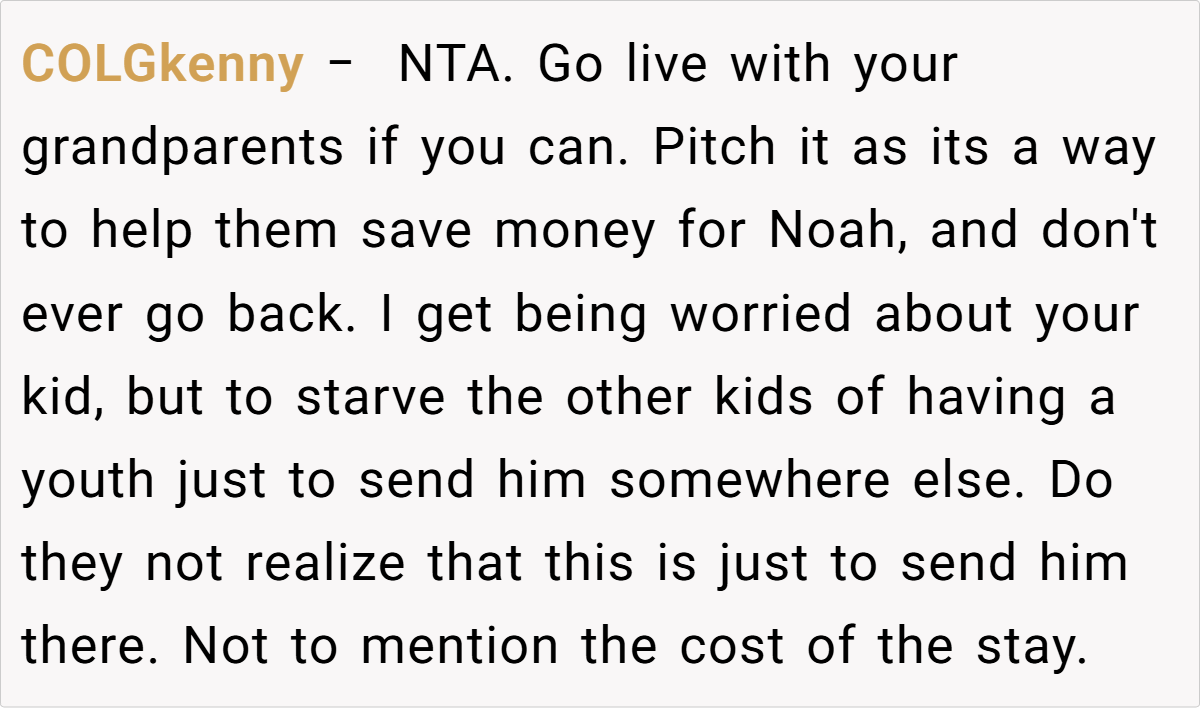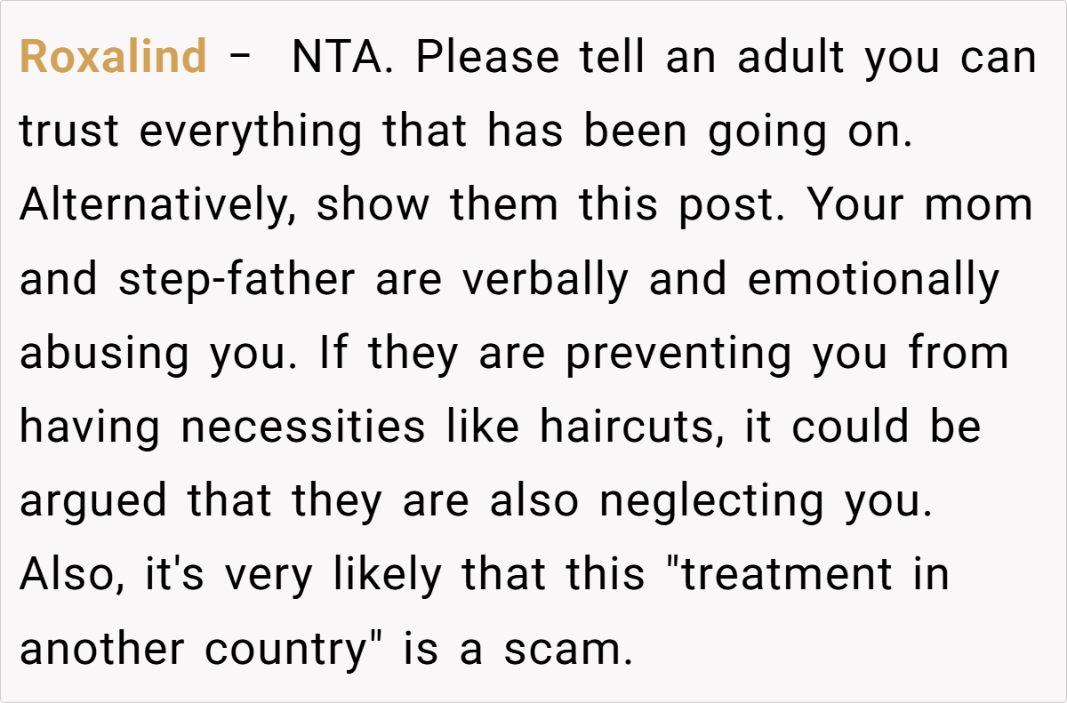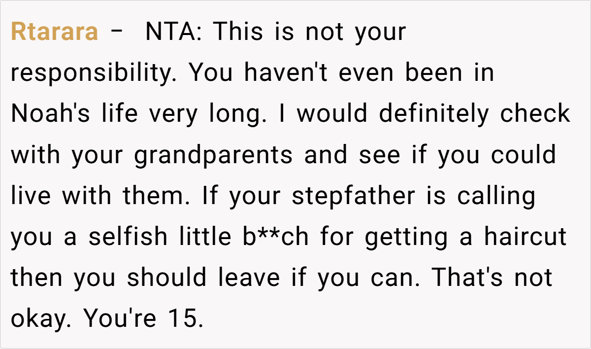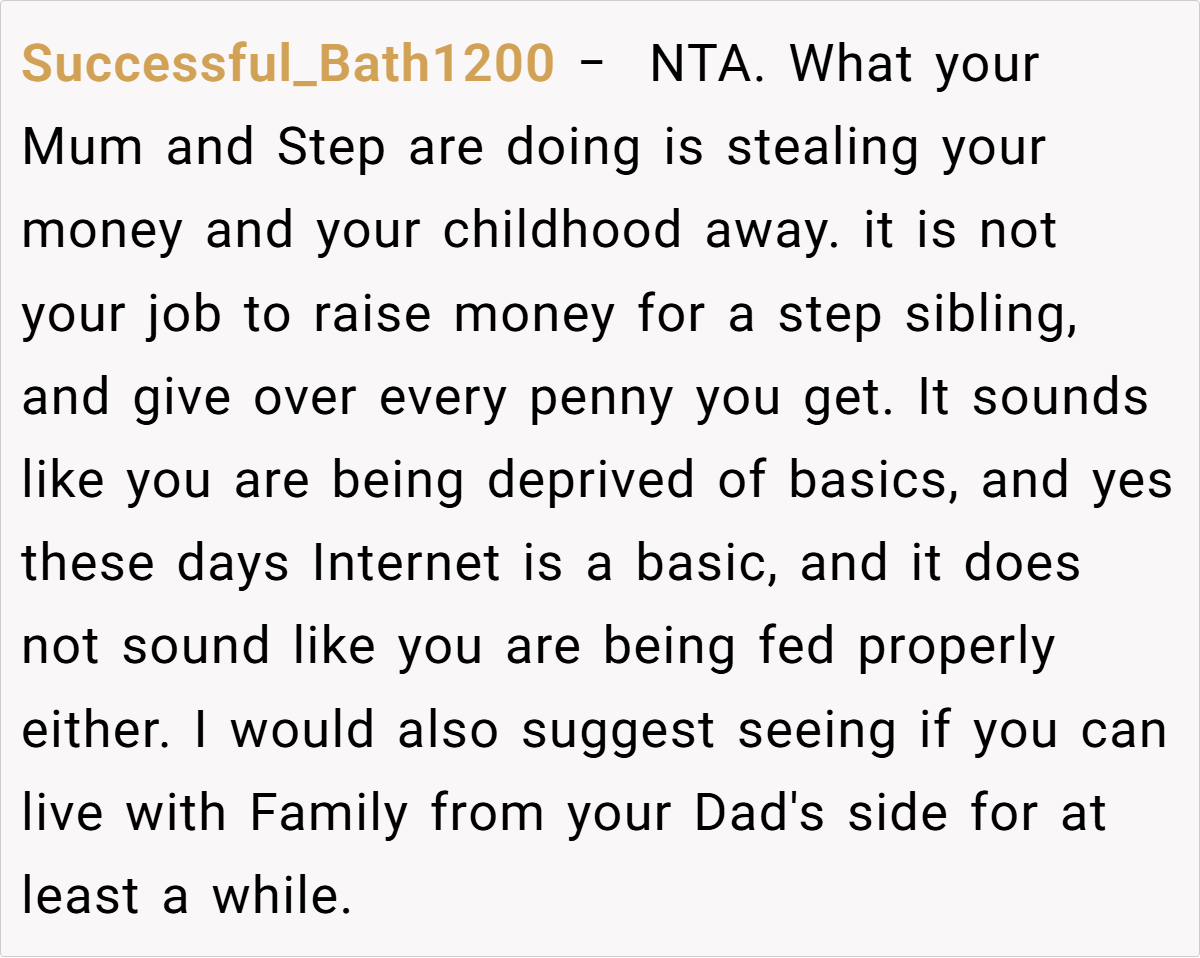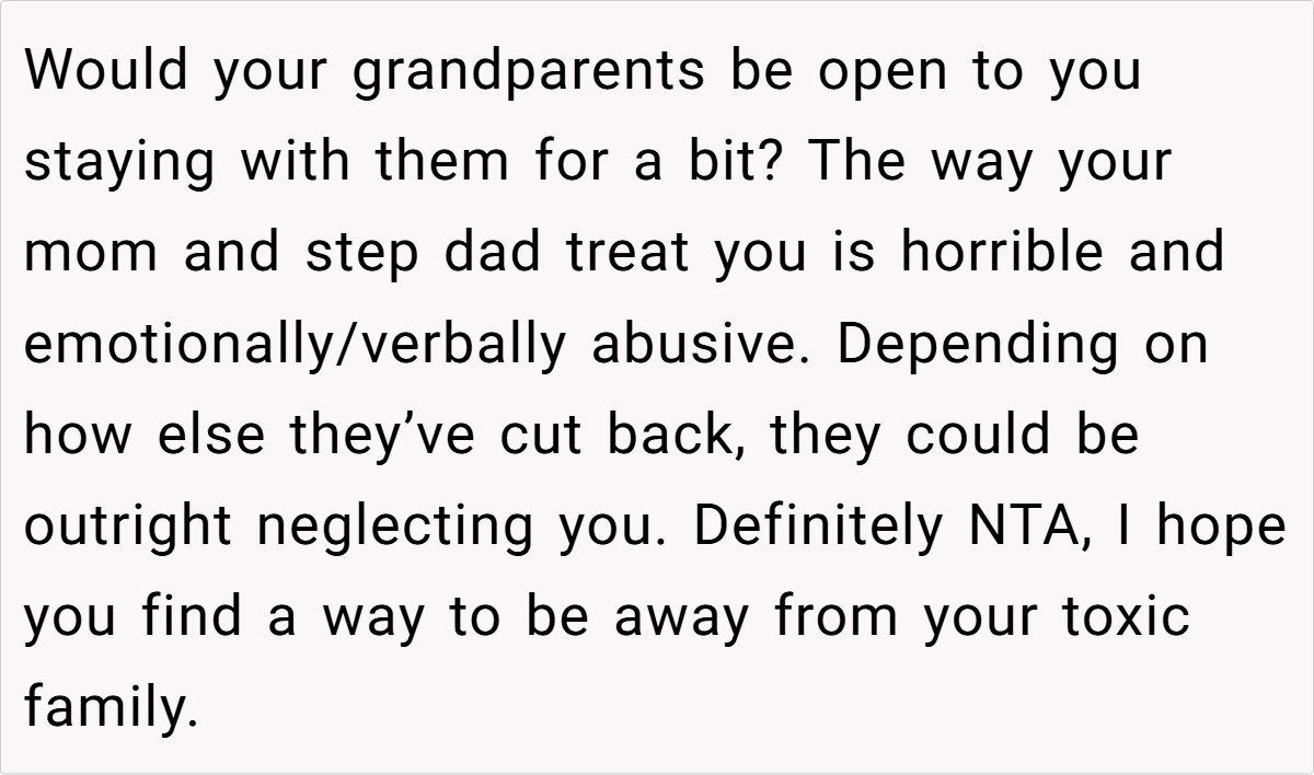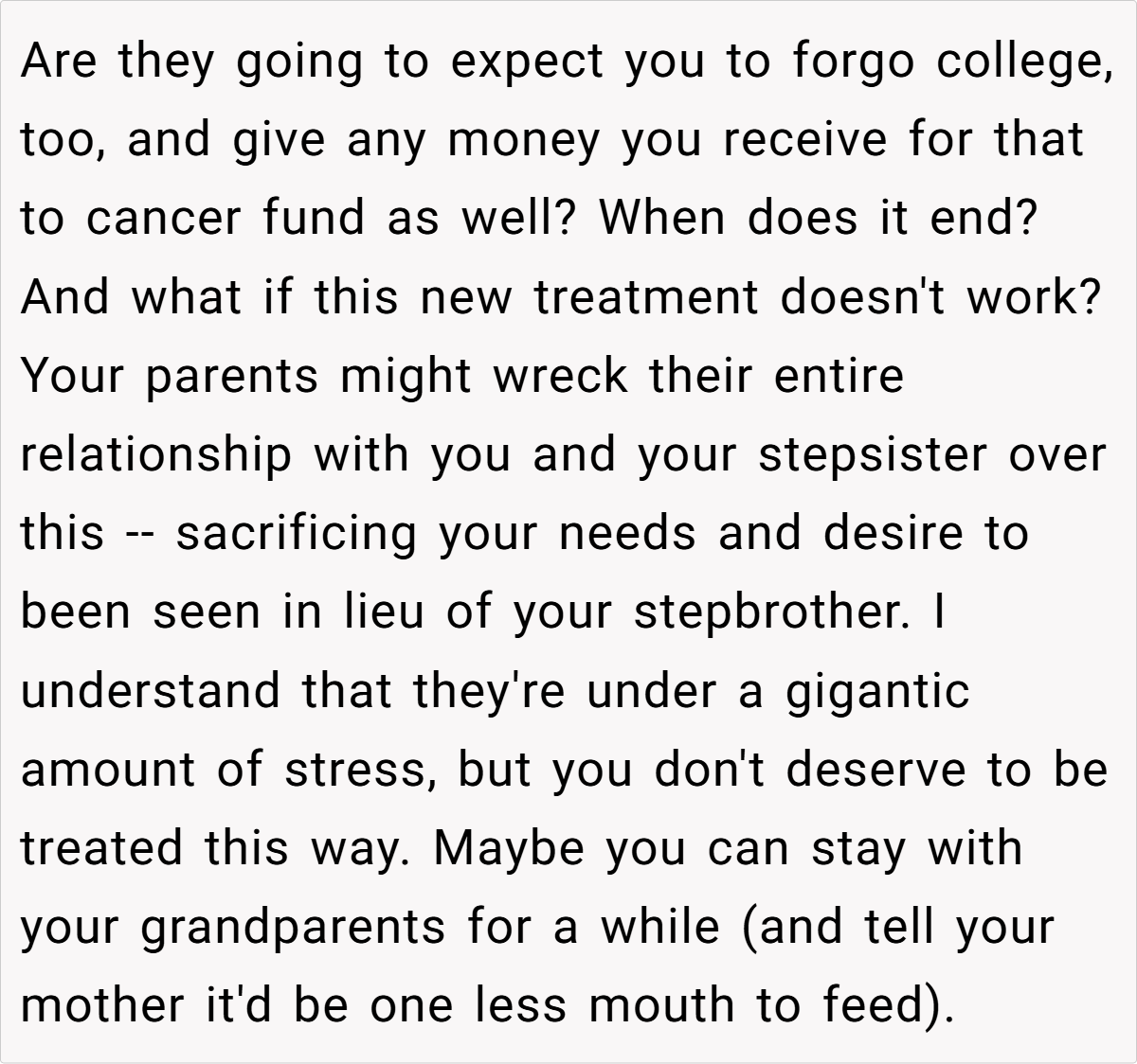 Many believe the actions of her mother and stepfather are emotionally manipulative, as they are asking her to sacrifice too much while ignoring her personal needs and rights. Some suggest that she consider living with her grandparents on her father’s side to escape the mistreatment and emotional strain.