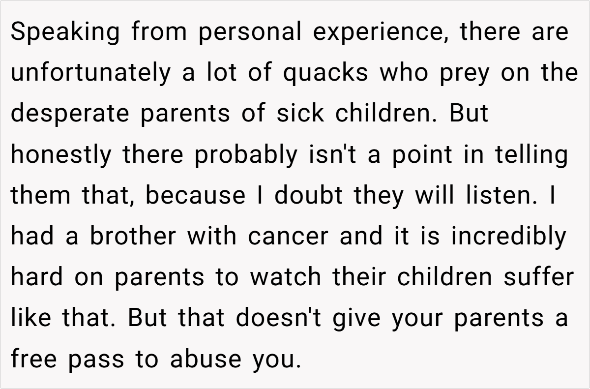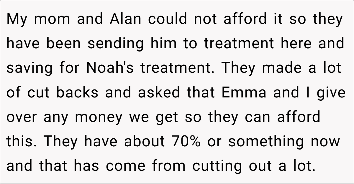 This situation brings to light the delicate balance between caring for a family member in need and ensuring that each family member’s emotional and physical well-being is respected. While it’s clear that Noah’s treatment is important, it is also clear that this young girl is being unfairly burdened by demands that should not be placed on her.