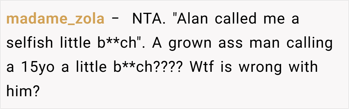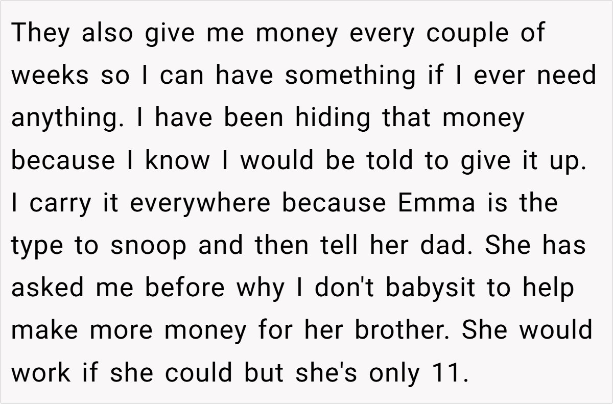 “The guilt placed on this 15-year-old for spending money given to her by her grandparents on herself and her friends is emotionally abusive. It undermines her autonomy, denies her childhood, and sets a dangerous precedent where her needs are consistently subordinated to those of others.”