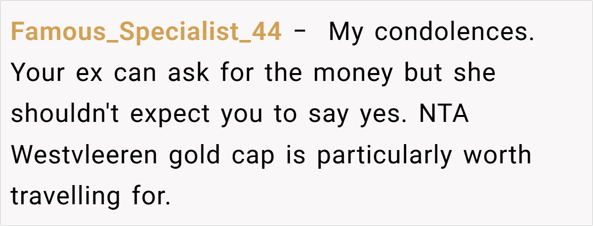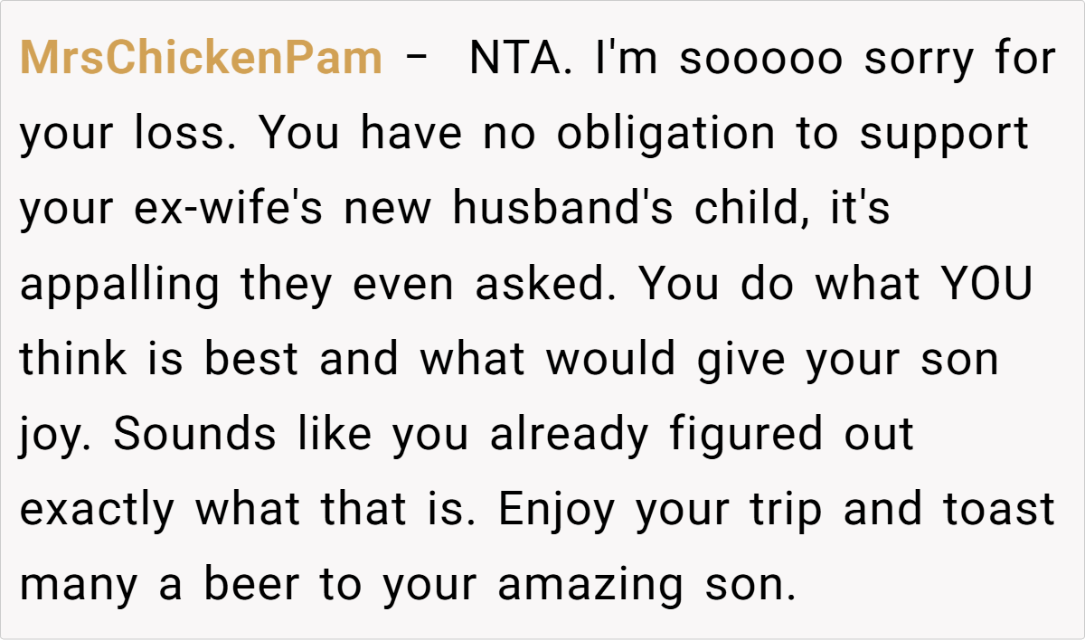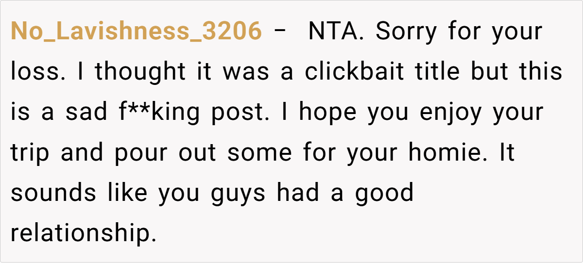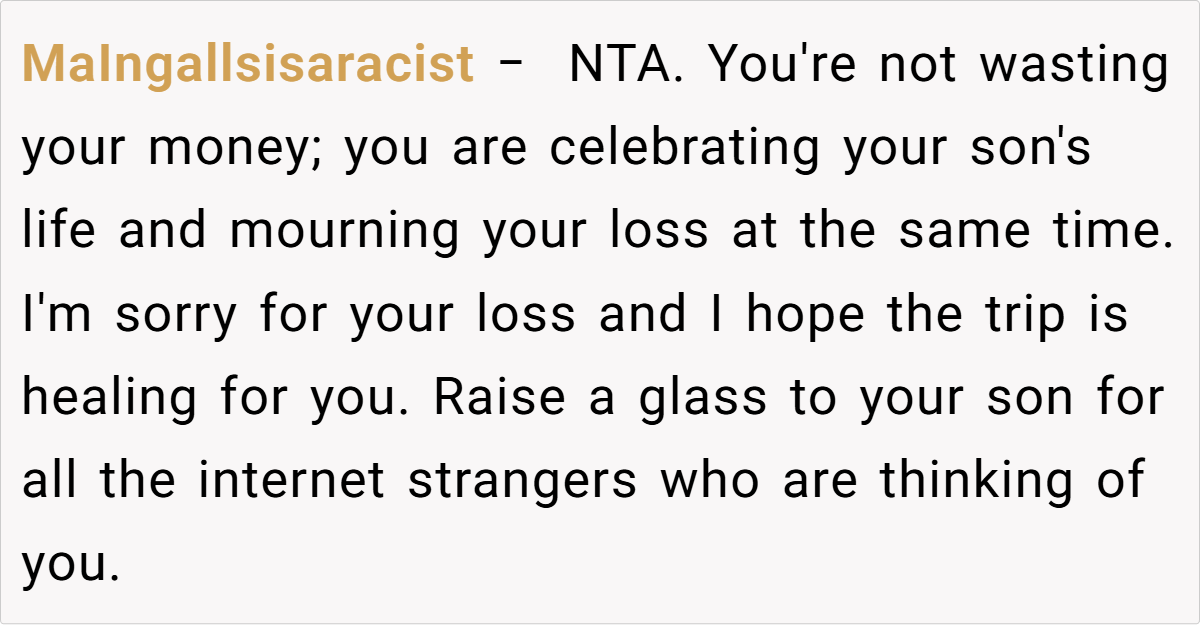 Many redditors admire the father’s bold tribute and argue that his son would have loved the humor and spirit behind the beer trip. They contend that grief manifests in many forms, and honoring a loved one in a unique, personal way can be both cathartic and meaningful. On the other hand, a significant number of commenters criticize the decision, labeling it as irresponsible and financially imprudent.