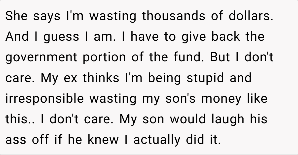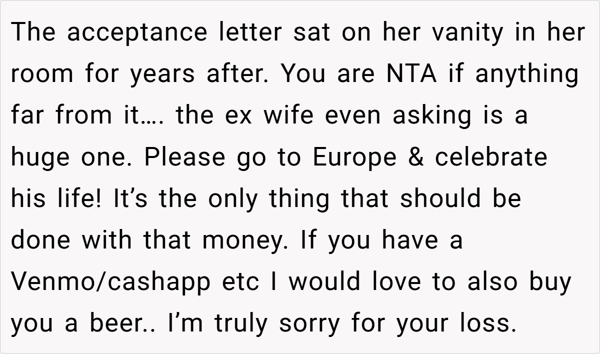 In conclusion, this update challenges us to consider the fine line between honoring a loved one’s memory and upholding financial responsibility. The father’s decision to spend his deceased son’s education funds on a celebratory trip to Europe is as unconventional as it is controversial.