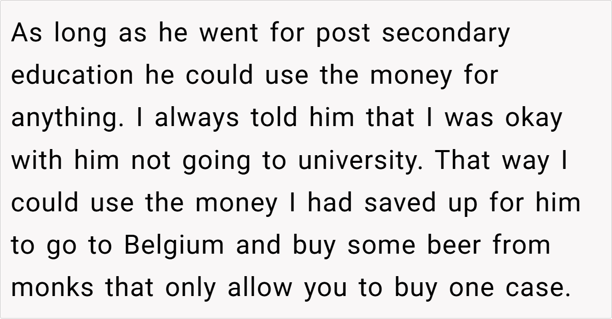 This update dives into one of the most controversial decisions a parent can make in the wake of tragedy. A father shares how he plans to spend his deceased son’s university fund on a trip to Europe to drink beer—a long-standing joke they shared—instead of giving it to his ex-wife’s step-son.