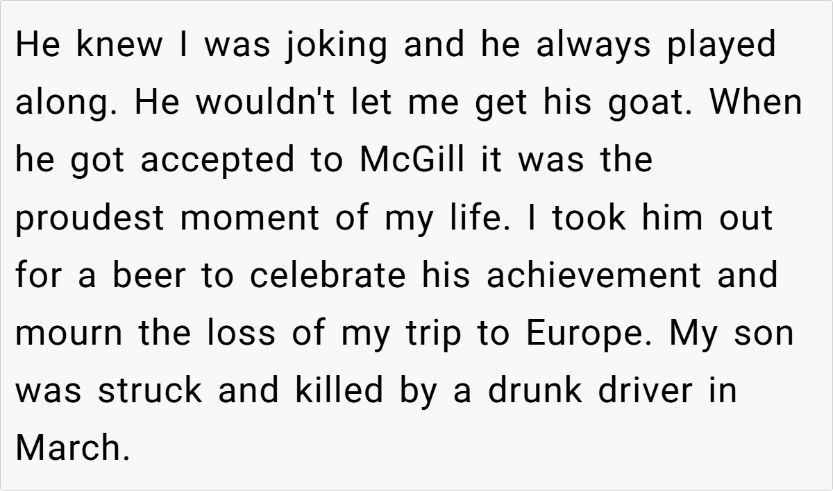 When profound loss intersects with deeply personal family traditions, parents may choose to honor their loved ones in ways that defy conventional expectations. Dr. Laura Markham, a psychologist specializing in grief and family dynamics, explains, “It’s not unusual for individuals to use humor and cherished memories as a means of coping with tragedy. In this case, the father’s decision to use his deceased son’s education fund for a European beer trip is a uniquely personal tribute—one that recalls the lighthearted promises they shared.”