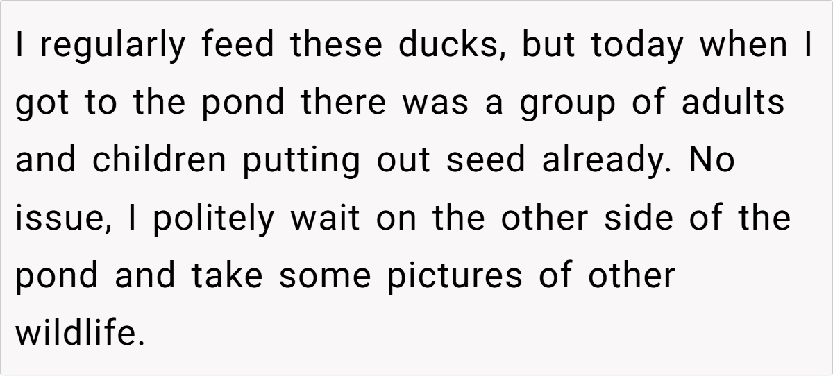 That’s the dilemma OP (Original Poster) faced when they visited their local pond to feed the ducks, only to find a group of children chasing and shouting at them. Rather than confronting the parents directly, OP simply offered food elsewhere, successfully luring the ducks away from the chaos. The children’s mother was not pleased, loudly declaring OP’s actions “bloody cheeky.” But was OP wrong to step in, or were they justified in redirecting the ducks for their own well-being?