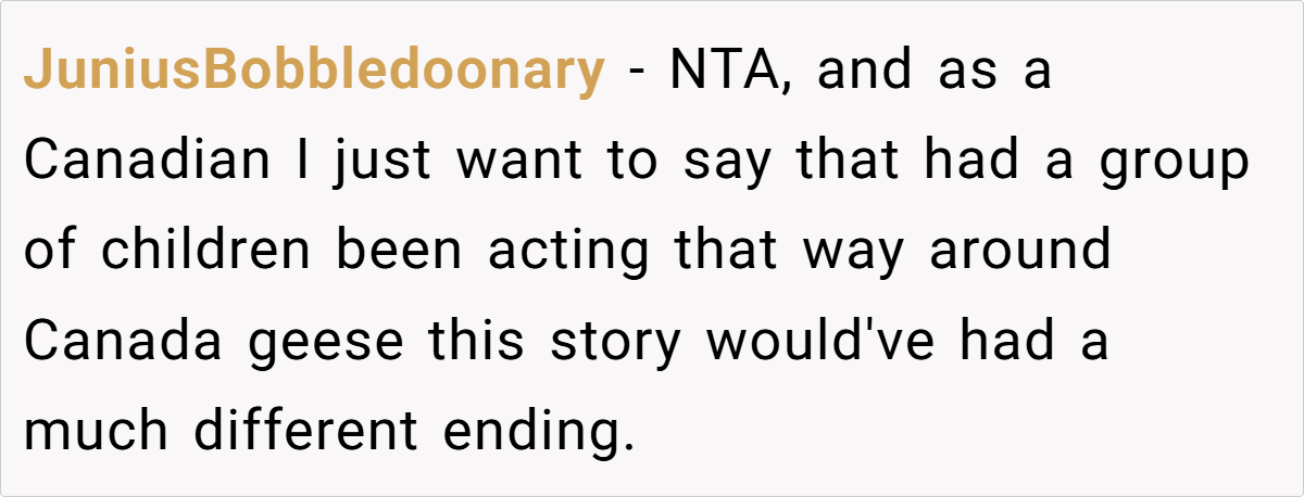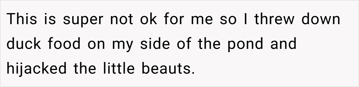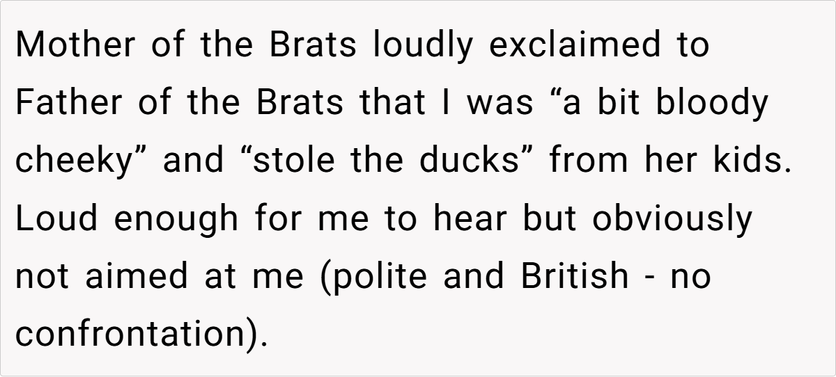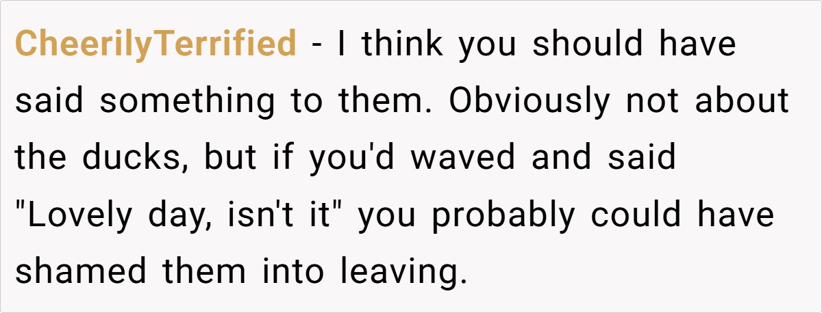 British culture is known for its non-confrontational nature, and OP’s approach—avoiding direct confrontation while subtly influencing the situation—is a classic example. Sociologist Dr. Emily Carter notes, “British social norms often prioritize indirect methods of dealing with conflict. OP’s decision to quietly redirect the ducks rather than directly reprimanding the parents fits this cultural mold.”