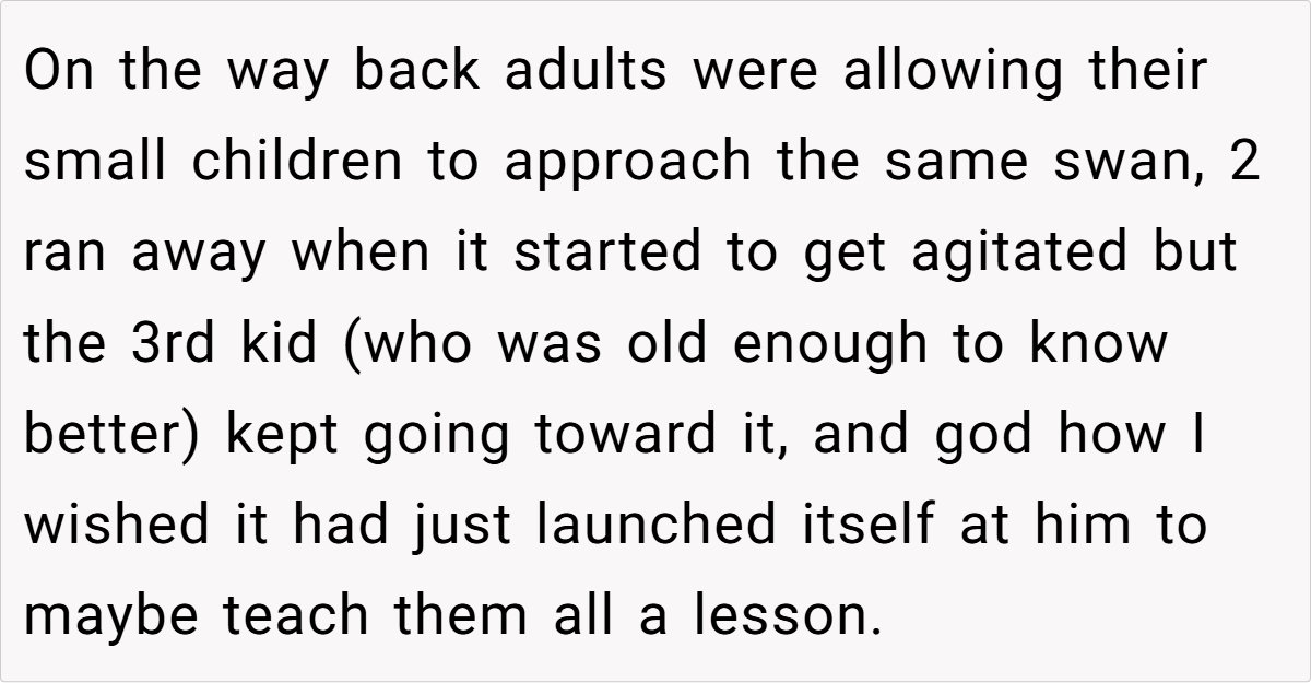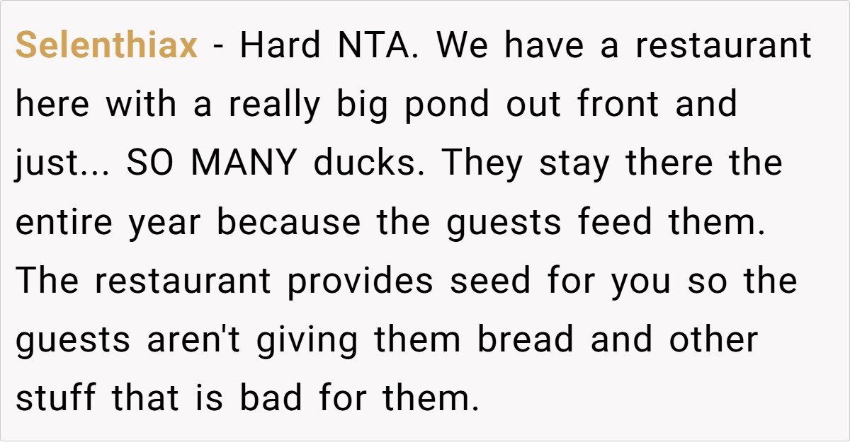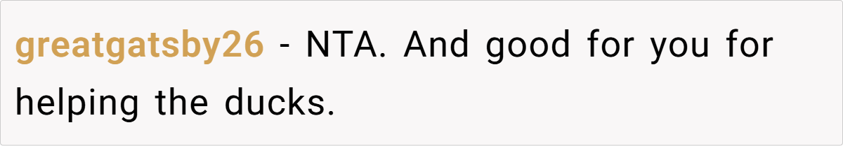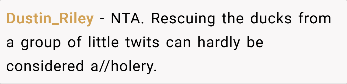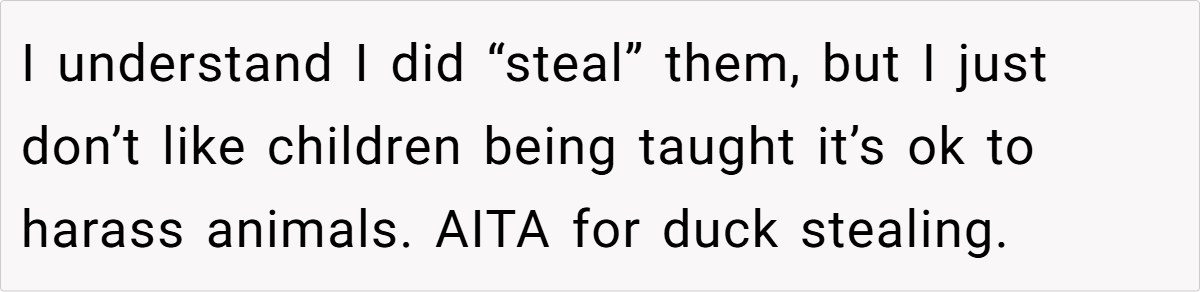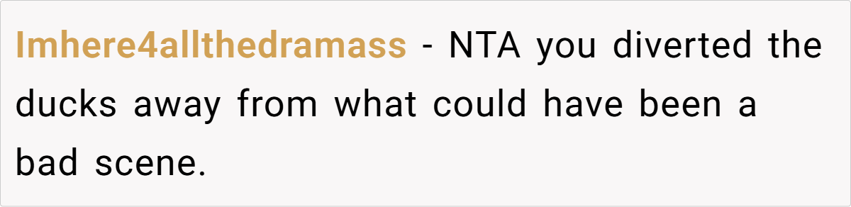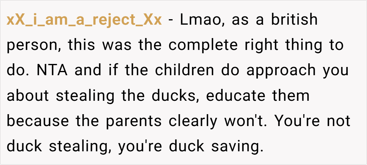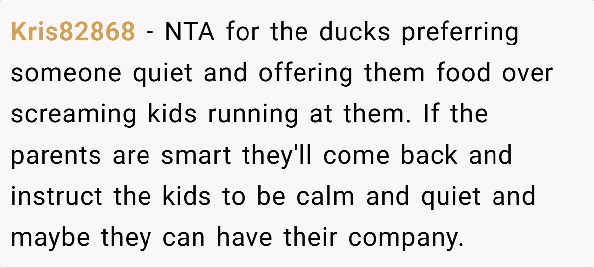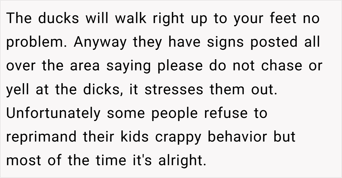 OP’s actions sparked an interesting debate about how to balance social politeness with ethical treatment of animals. While they managed to protect the ducks, should they have taken it a step further by addressing the parents? Or was their quiet intervention the best possible response? Let us know what you think in the comments below!