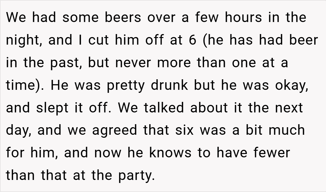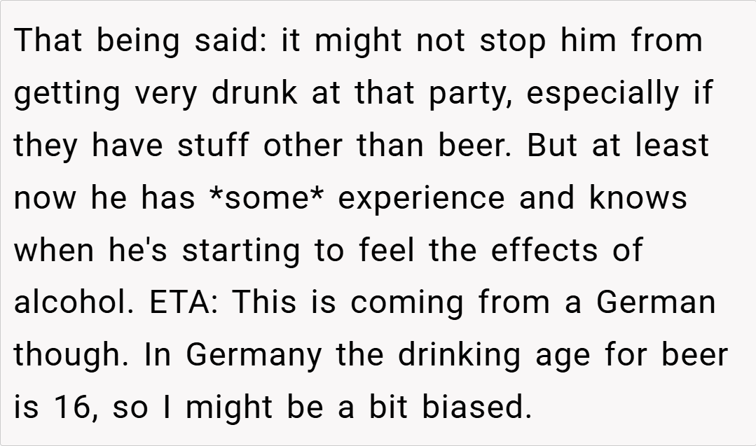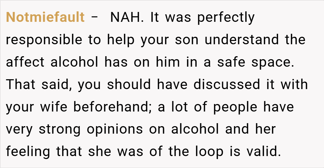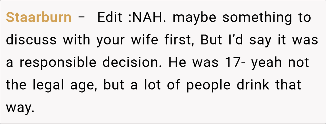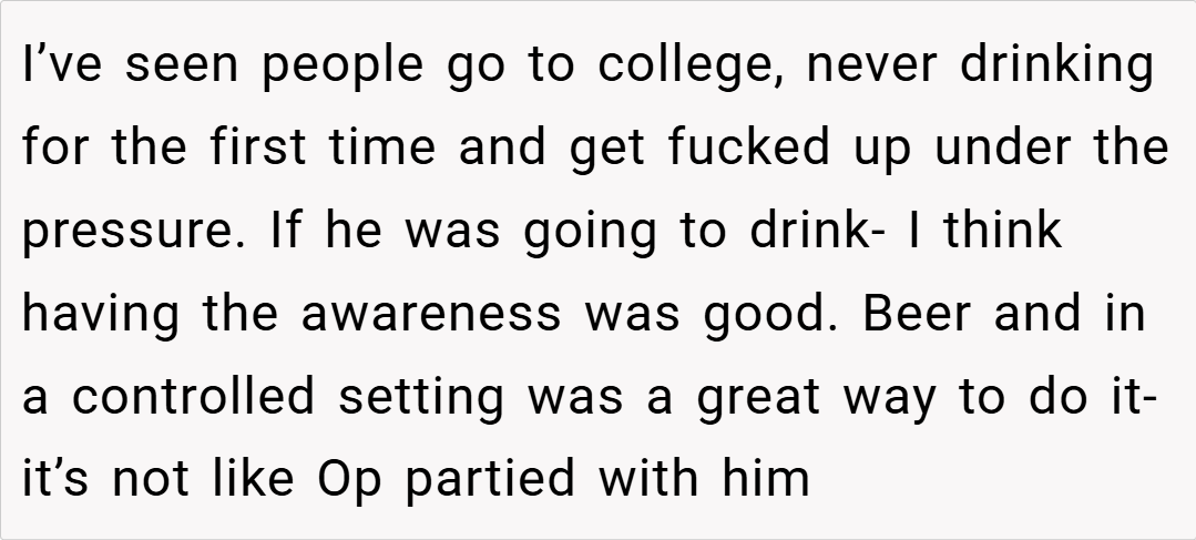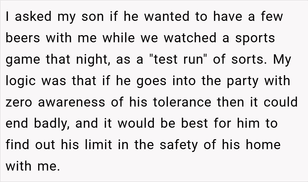 Reddit users have been sharply divided over this issue. Many argue that the father’s intention—to create a controlled setting for his son’s first drinking experience—is a pragmatic harm‑reduction approach, especially in an environment where teenage drinking is common. One commenter wrote, “Learning your limits in a safe space is better than stumbling into a party unprepared.” However, others feel that providing alcohol to a minor is inherently reckless, regardless of the context. Some even suggest that this method risks normalizing underage drinking and could have legal repercussions. Despite the differences, most agree that the underlying issue is complex and heavily dependent on personal and cultural values.