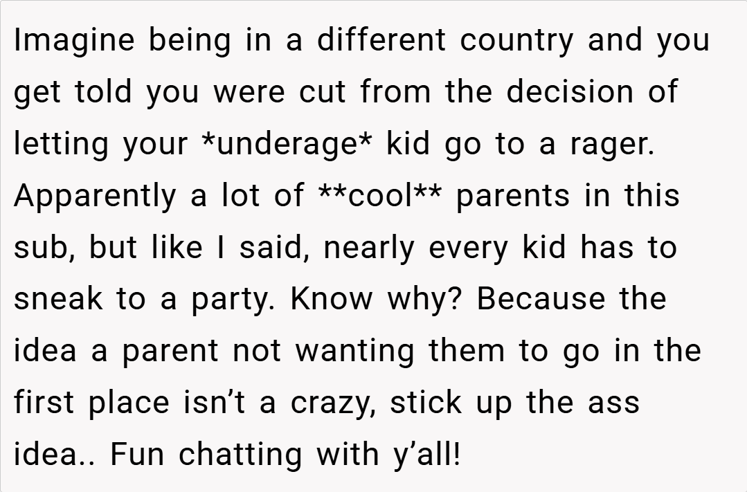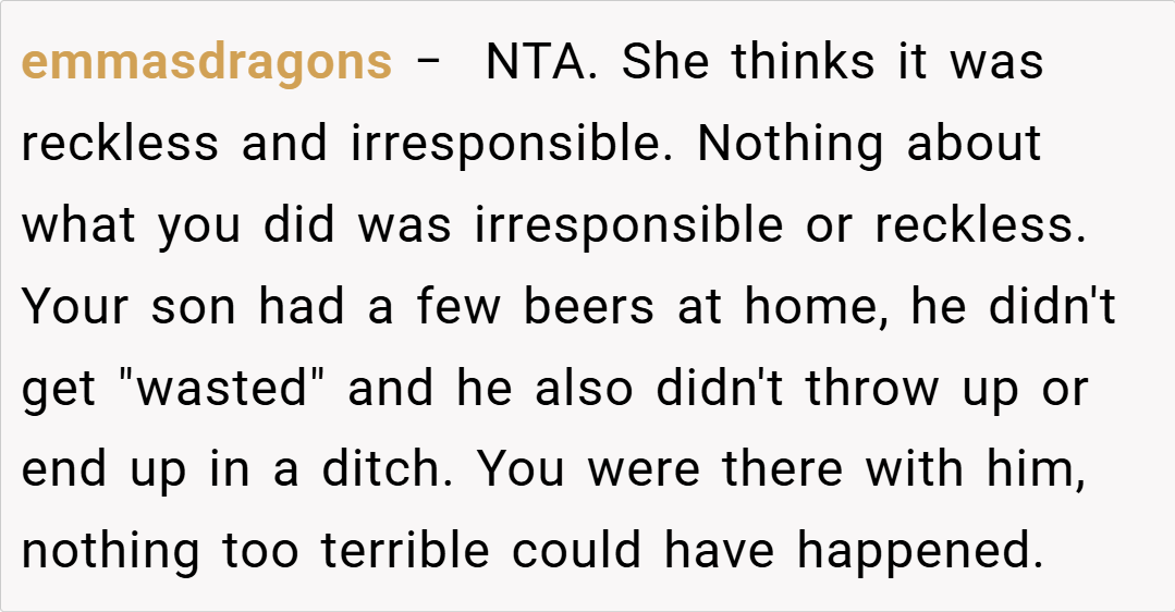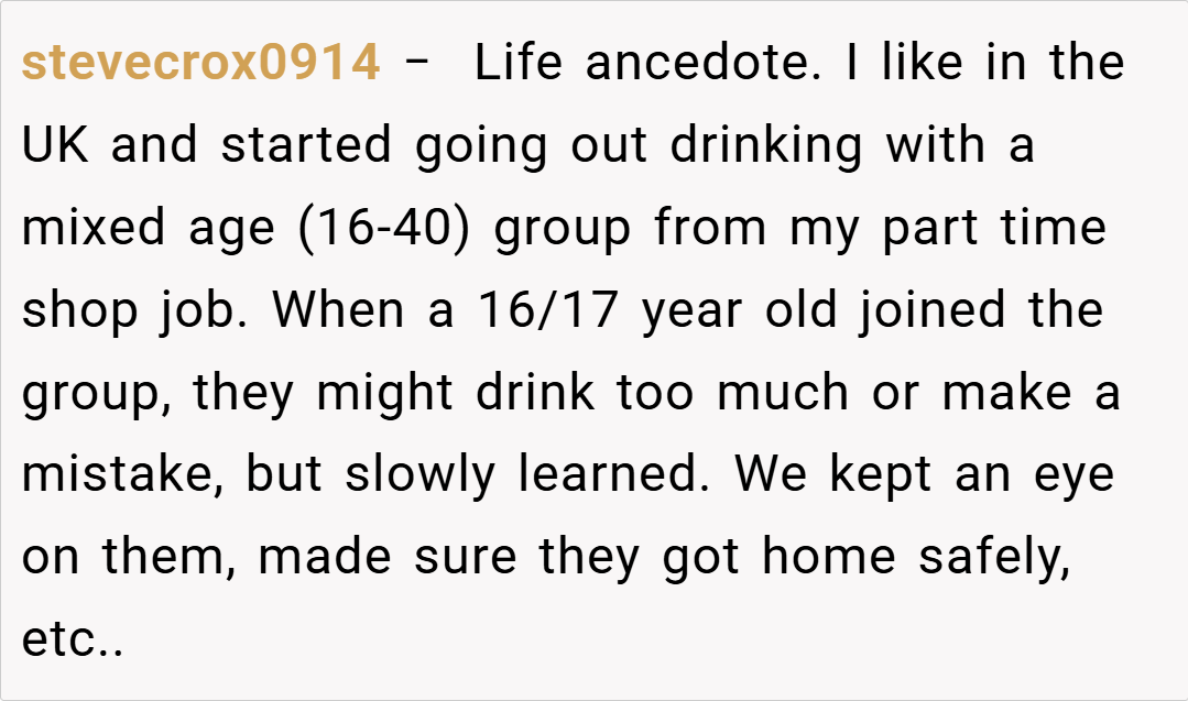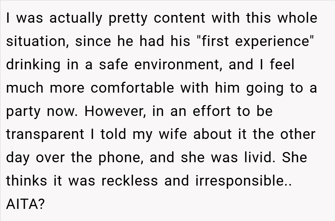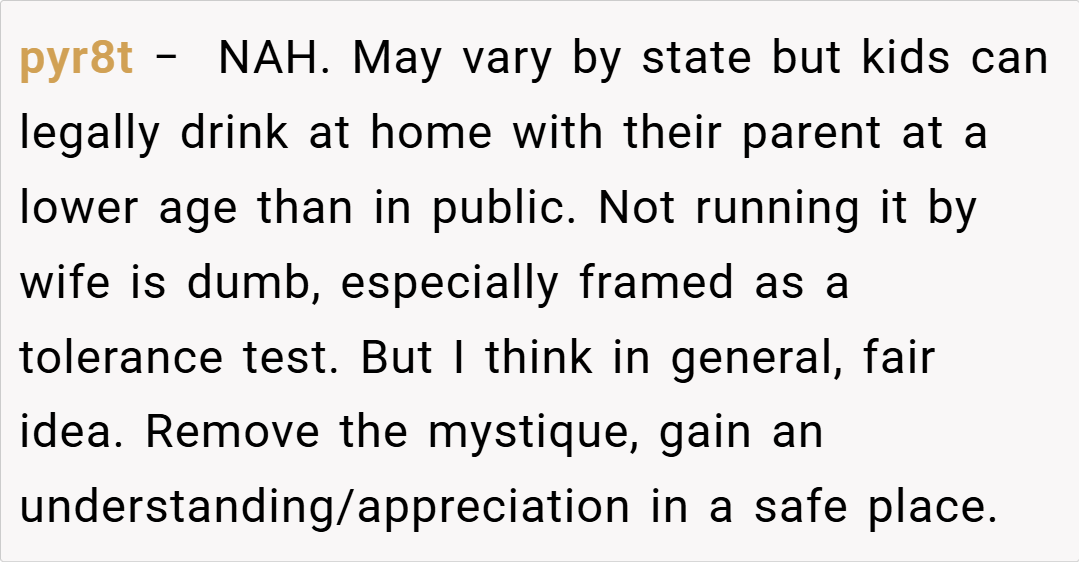 Reddit users have been sharply divided over this issue. Many argue that the father’s intention—to create a controlled setting for his son’s first drinking experience—is a pragmatic harm‑reduction approach, especially in an environment where teenage drinking is common. One commenter wrote, “Learning your limits in a safe space is better than stumbling into a party unprepared.” However, others feel that providing alcohol to a minor is inherently reckless, regardless of the context. Some even suggest that this method risks normalizing underage drinking and could have legal repercussions. Despite the differences, most agree that the underlying issue is complex and heavily dependent on personal and cultural values.