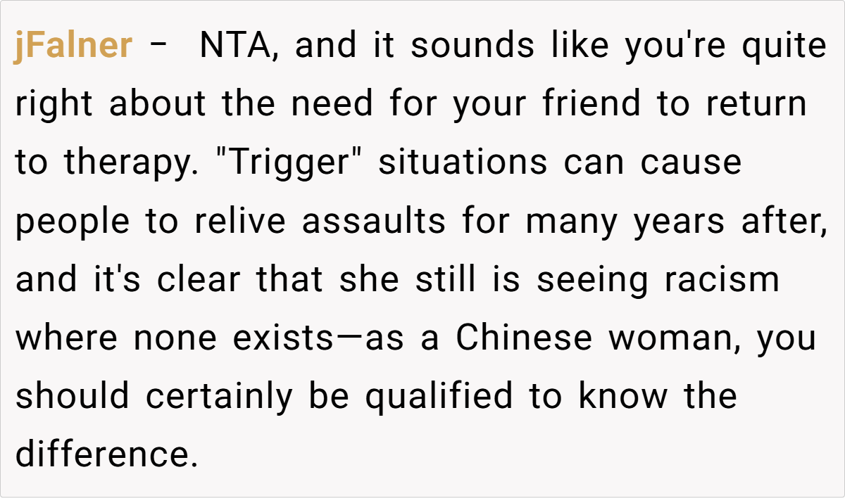 AITA for suggesting my friend go back to therapy after how she reacted in a Chinese Restaurant?
